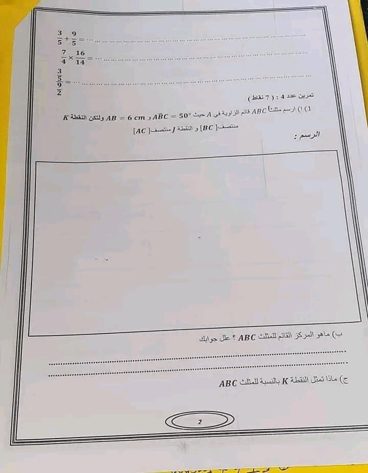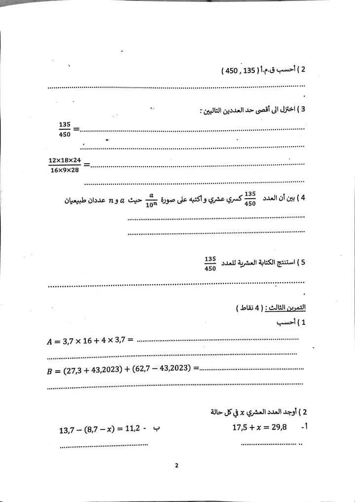 فرض تأليفي عدد 2 رياضيات بالاصلاح سابعة أساسي
