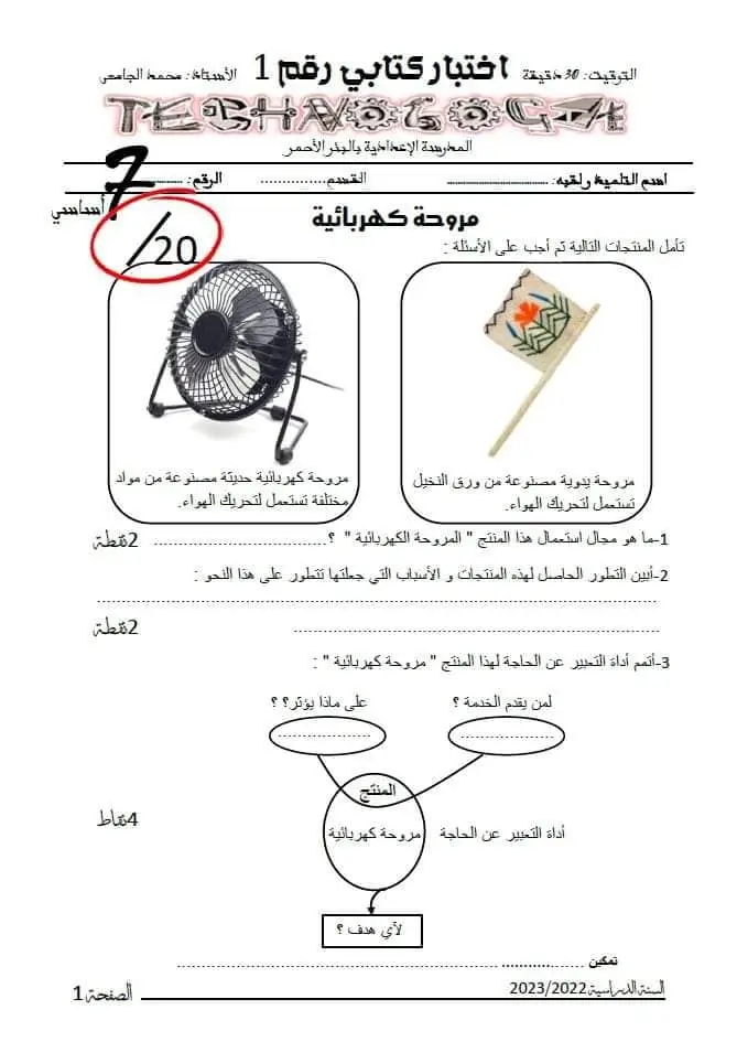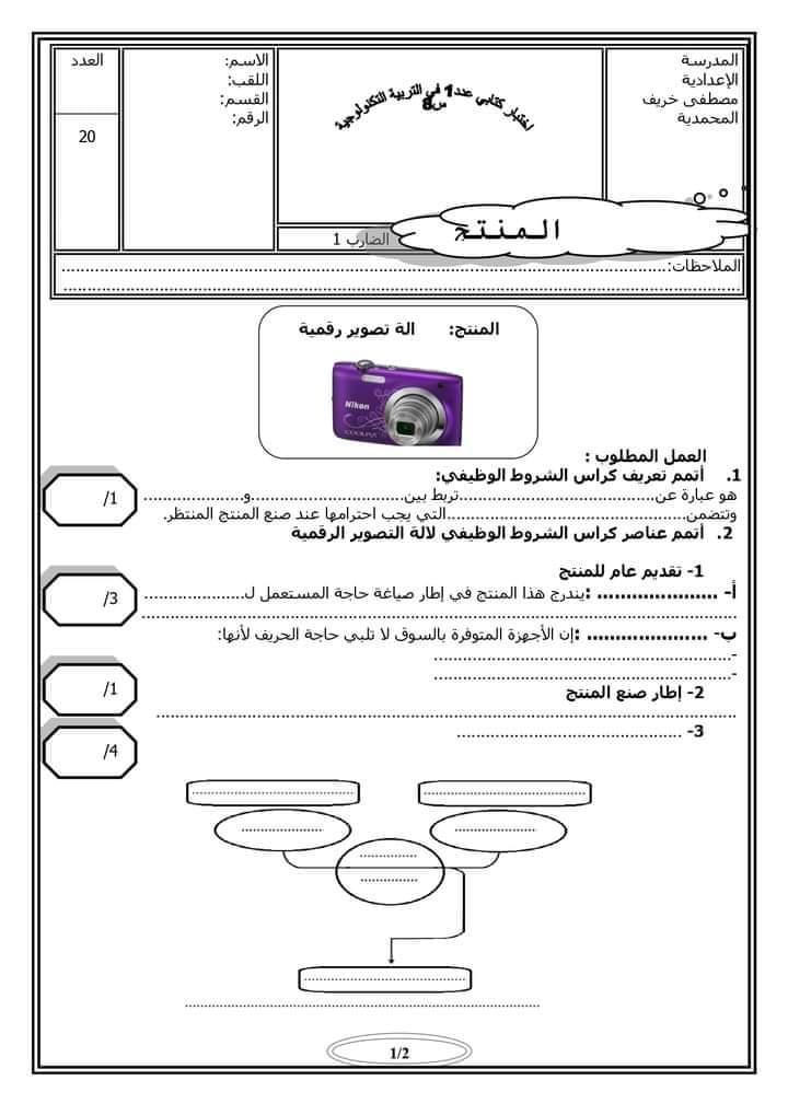 "إختبار كتابي عدد 1 لمادة التكنولوجيا"