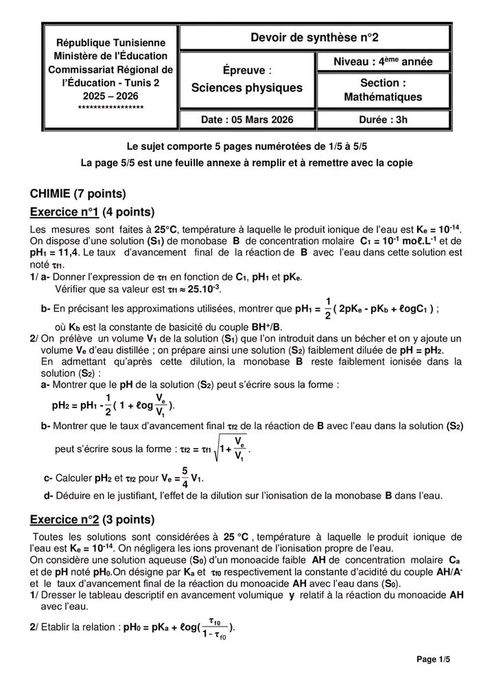 Correction Devoir de synthèse n°2 en physique ✍️ 2025/2026 Regional Tunis 2 4ème années Maths