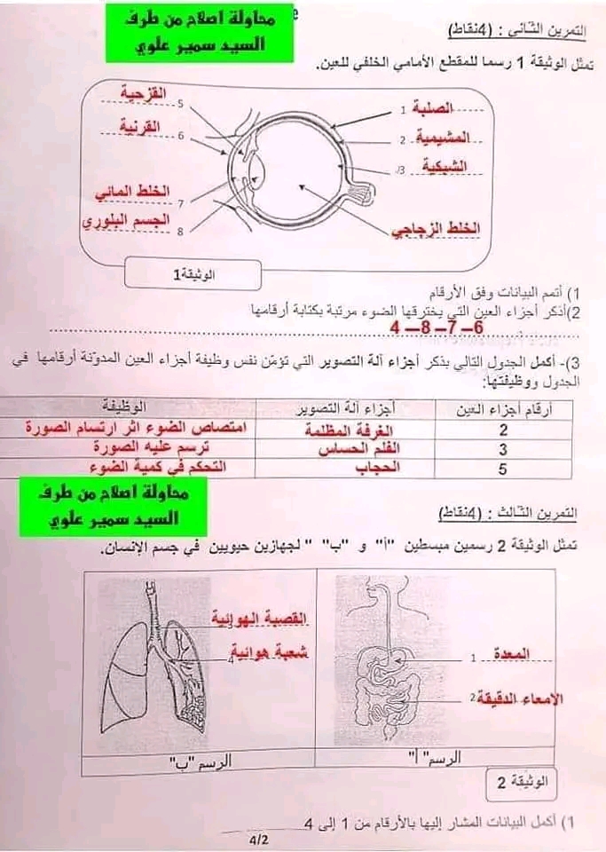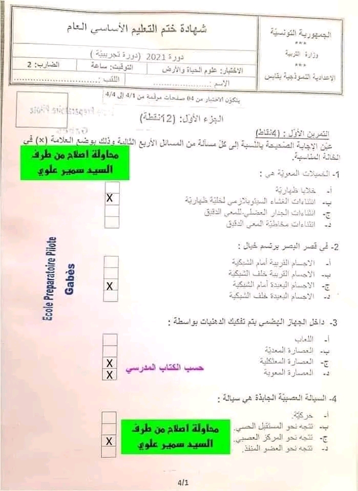 اختبار بالإصلاح علوم الحياة و الأرض لشهادة ختم التعليم الاساسي دورة 2024
