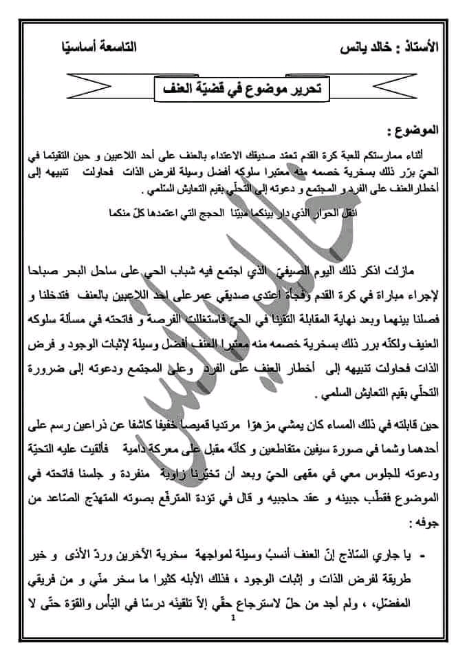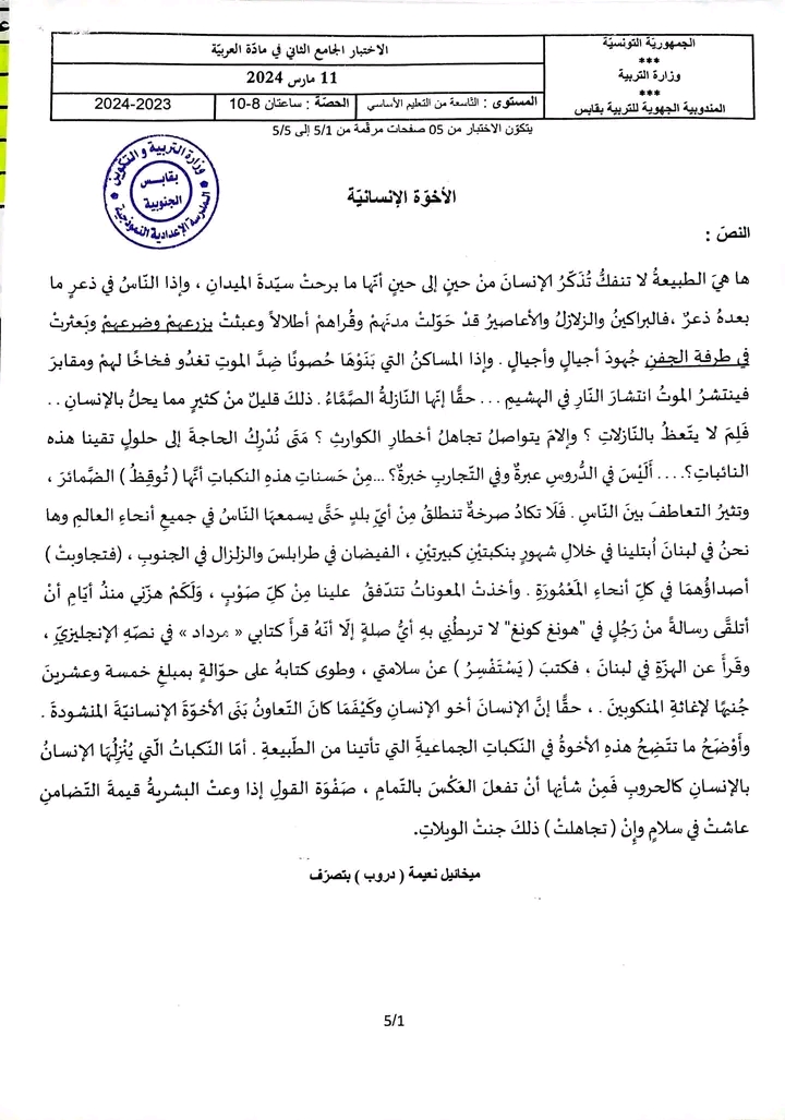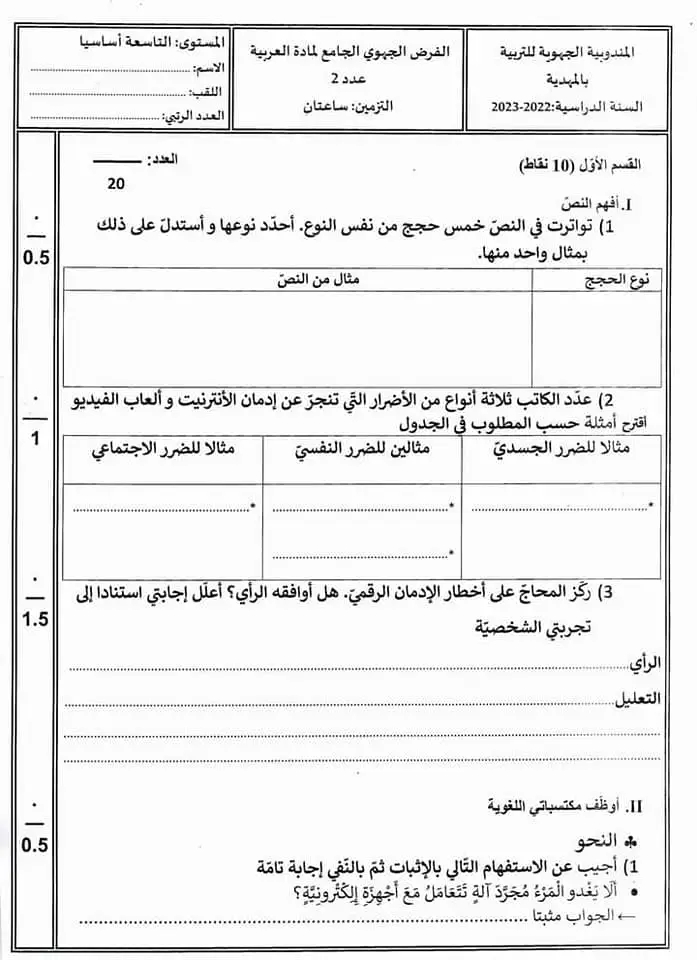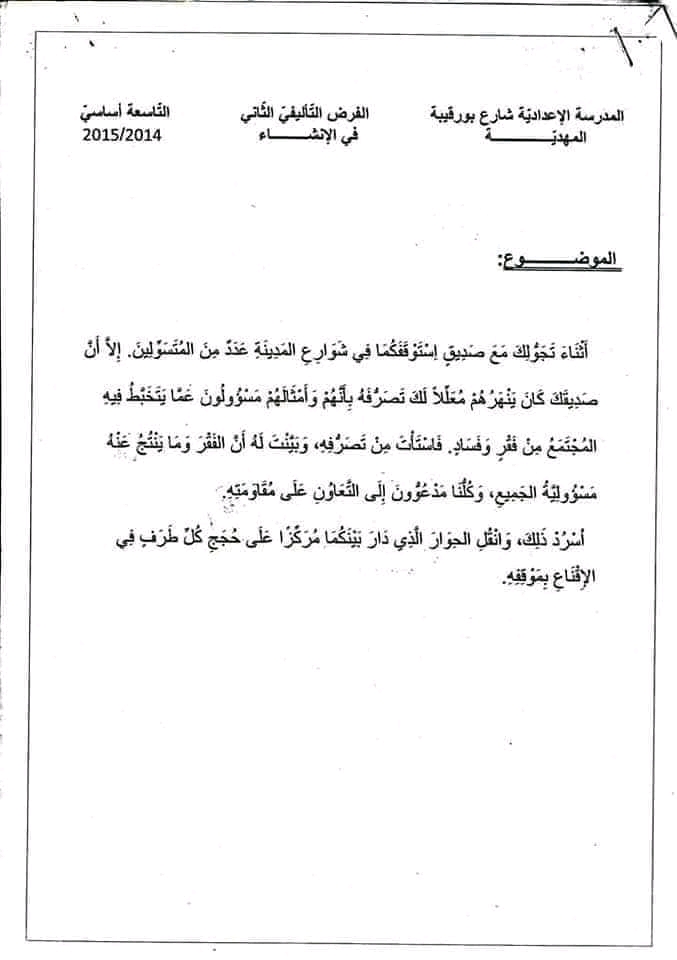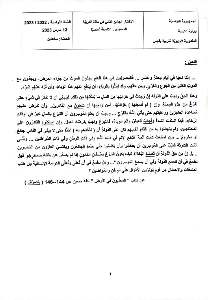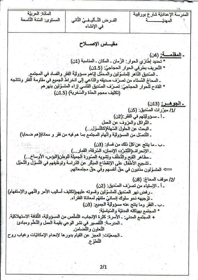 الإختبار الجامع الثاني في مادة العربية للسنوات التاسعة أساسي، مرفق بالإصلاح .