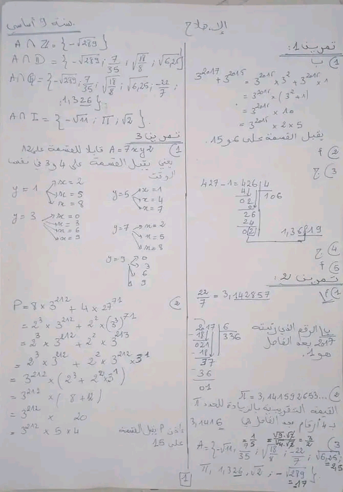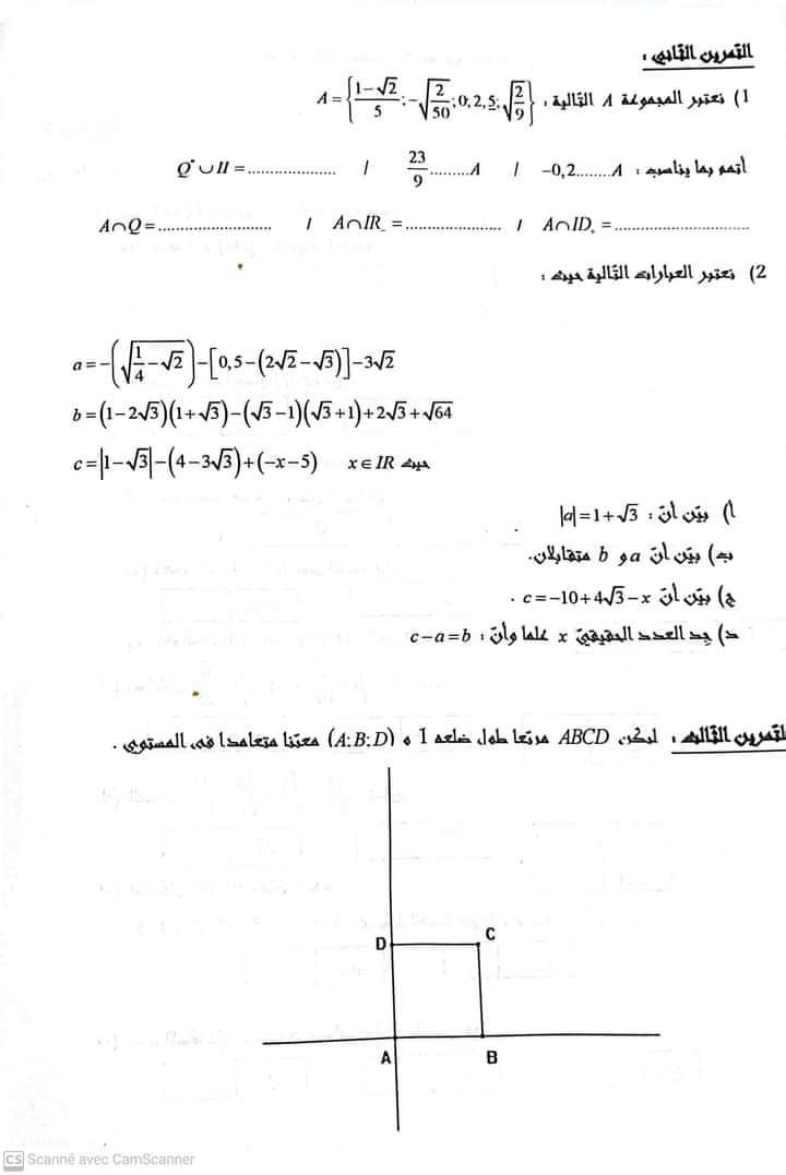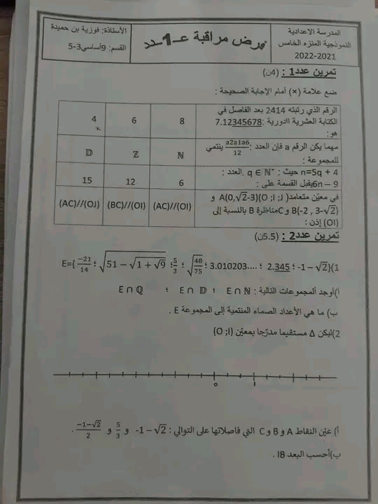 فرض مراقبة عدد 1 رياضيات بالاصلاح تاسعة أساسي