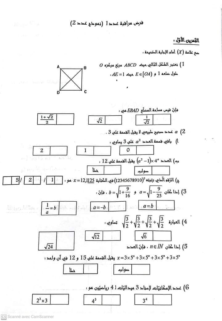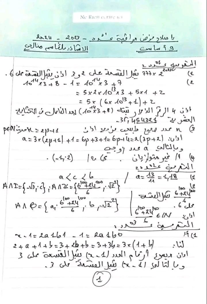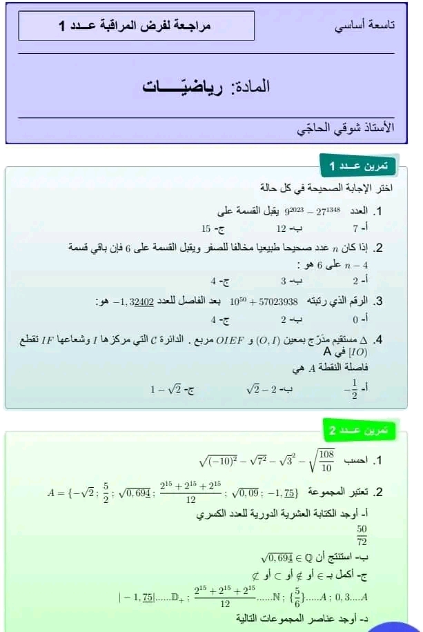 مراقبة عدد 1 مع الإصلاح المستوى 9 أساسي رياضيات