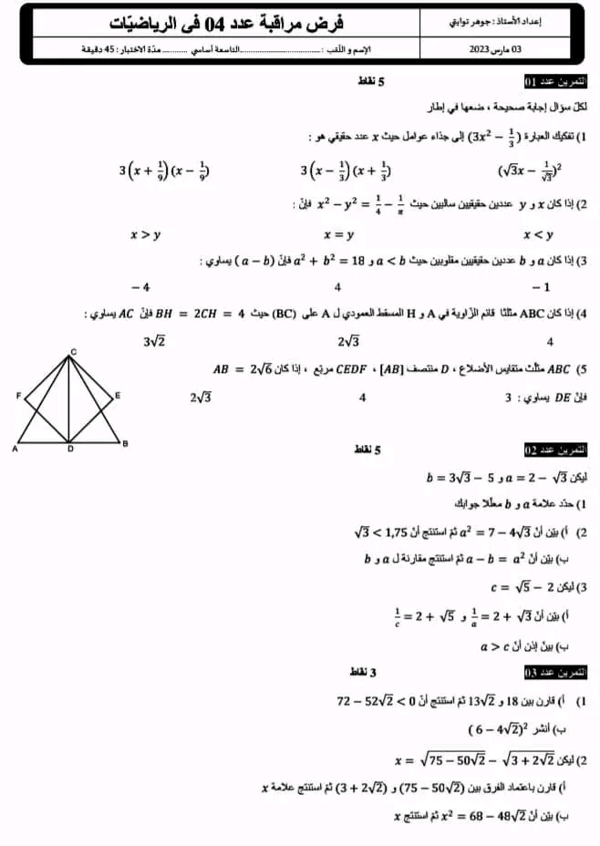 فرض مراقبة عدد 4 رياضيات 9 اساسي مرفق بالاصلاح