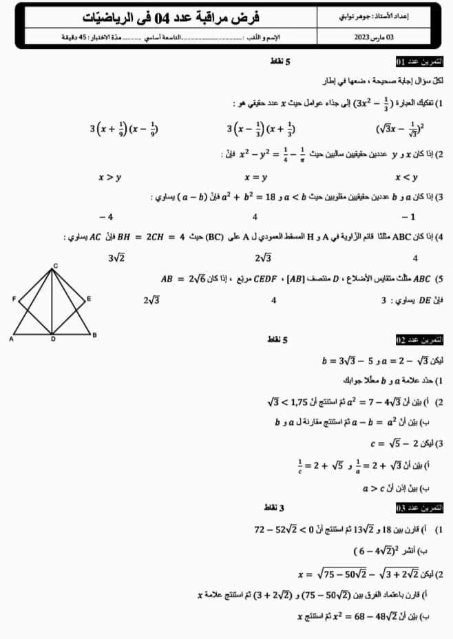 فروض مراقبة عدد4 في مادة الرياضيات بالاصلاح