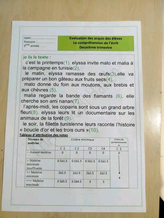 Évaluation français trimestre 1