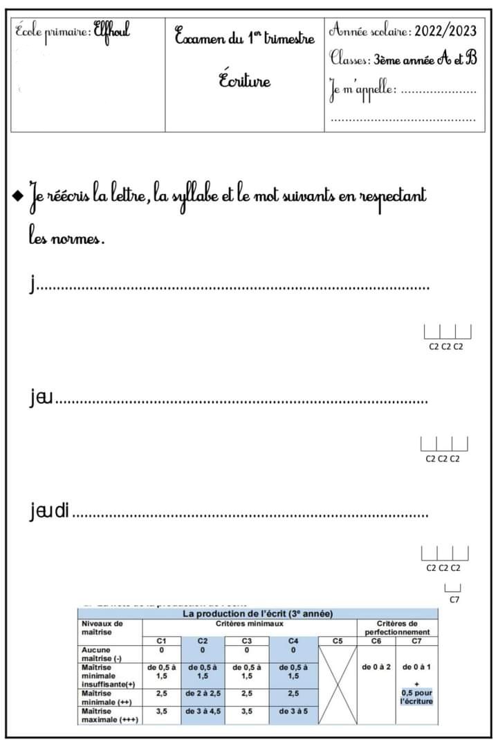 تقييم ثلاثي ثاني بالاصلاح فرنسية سنة ثالثة