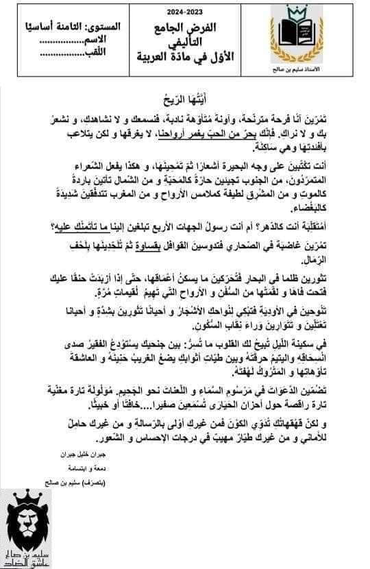 فرض تأليفي عدد 1 في دراسة النص (8 أساسيّا)