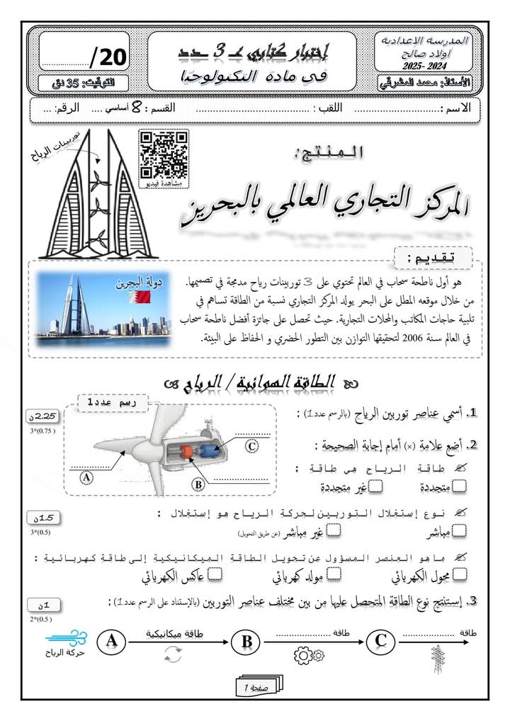 "إختبار كتابي عدد 3 لمادة التكنولوجيا"