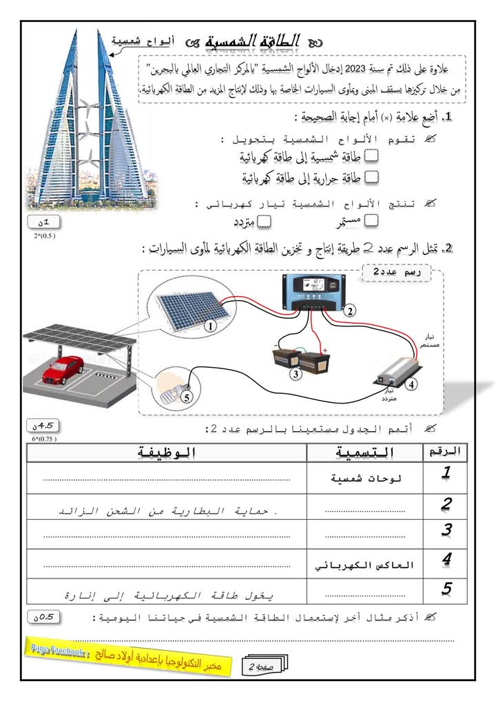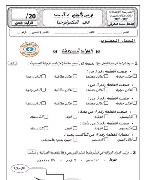 فرض تأليفي عدد 2 في مادة التربية التكنولوجية بالاصلاح