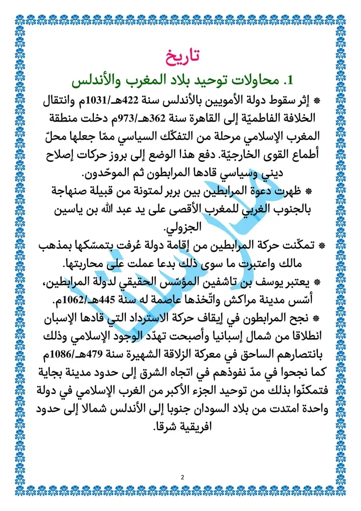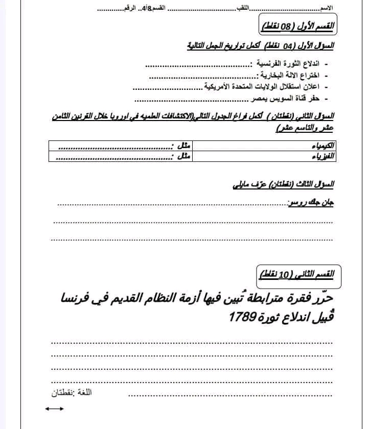 اختبار كتابي عدد 2 في مادة التاريخ