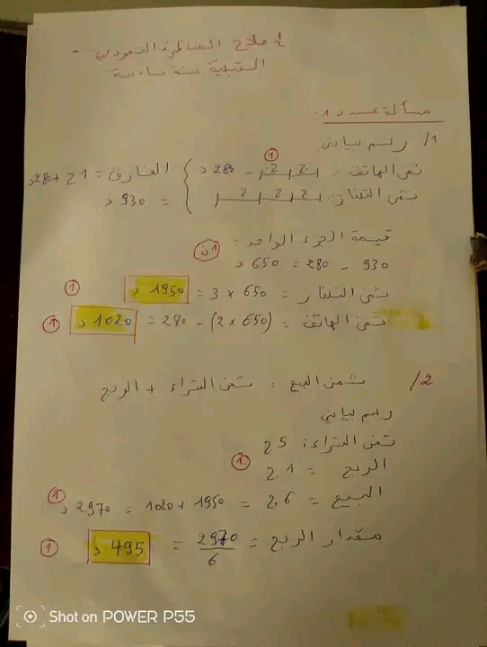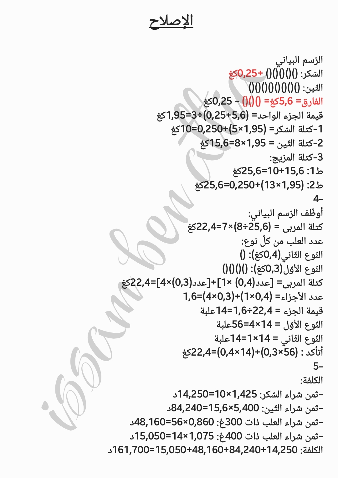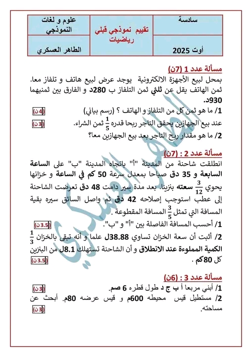 تقييم قبلي نموذجي بالاصلاح سنة سادسة في الرياضيات