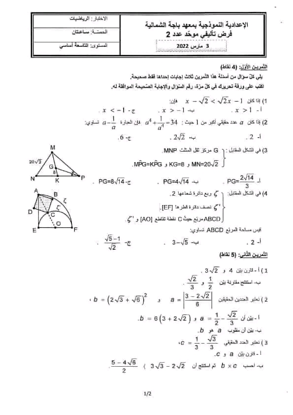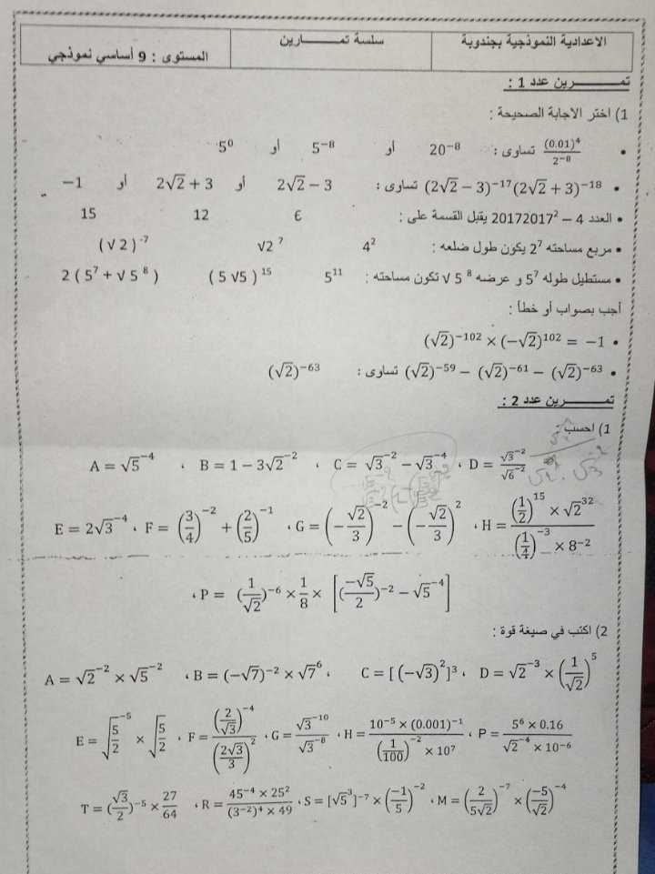 سلسلة تمارين رياضيات تاسعة نموذجي
