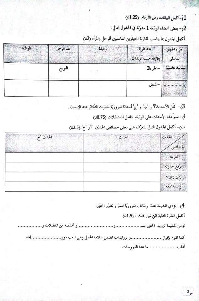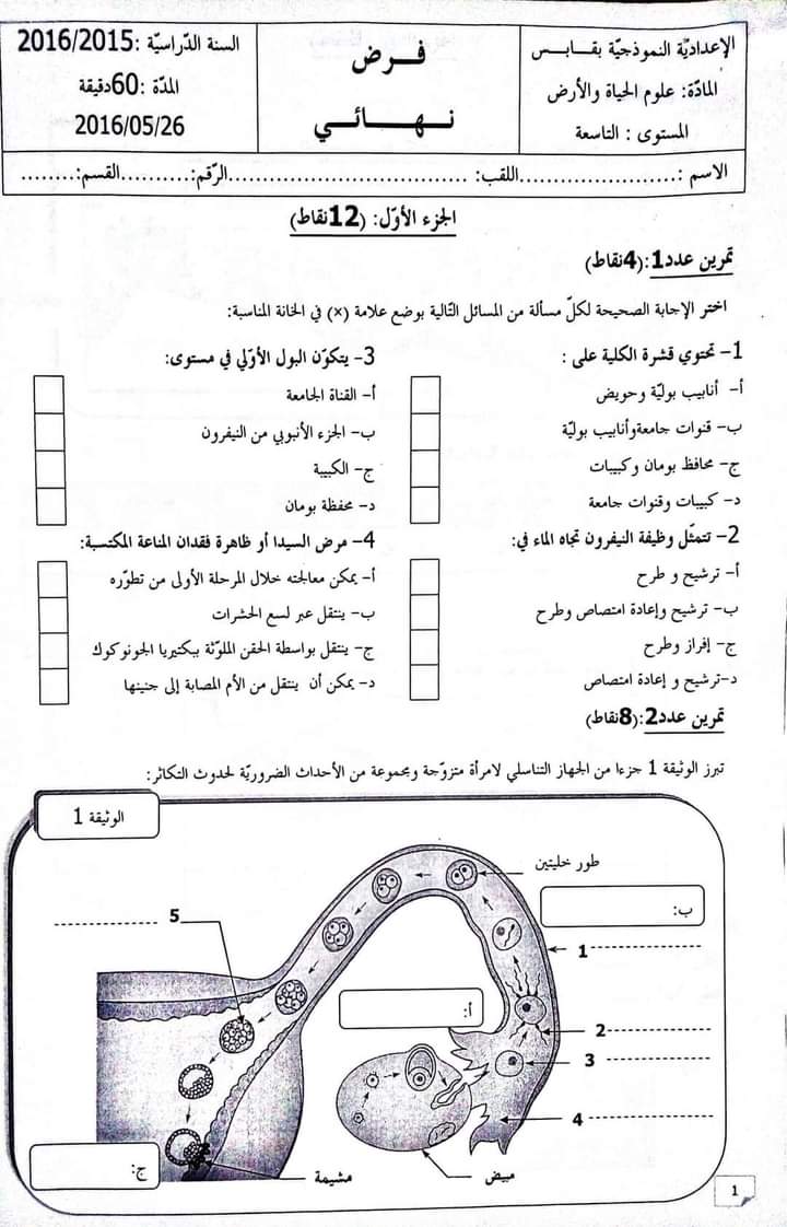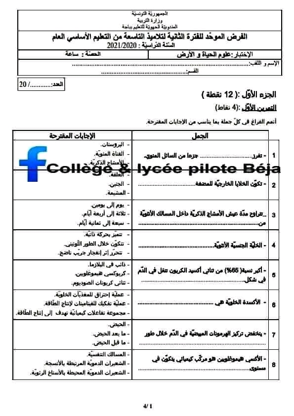 فرض نهائي ، علوم الحياة و الأرض للسنوات التاسعة نموذجي بقابس .