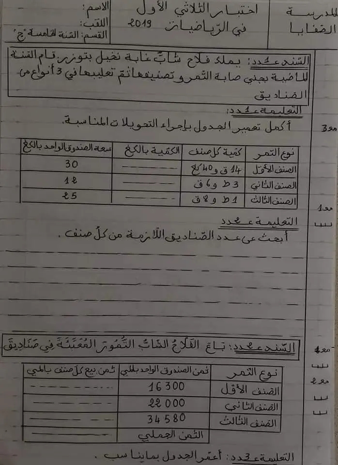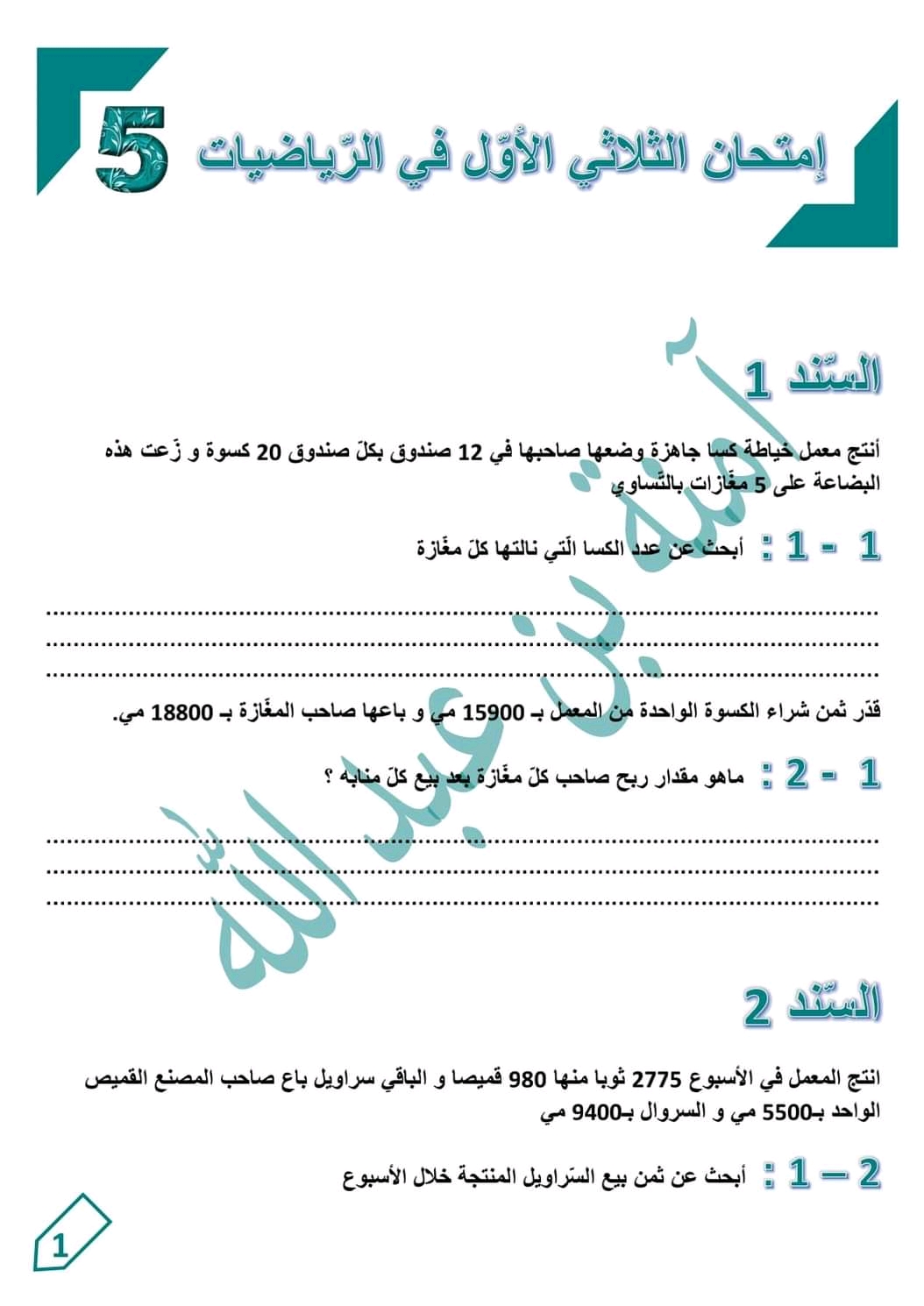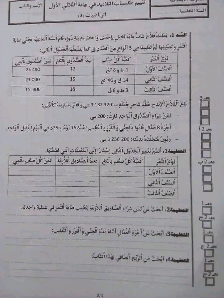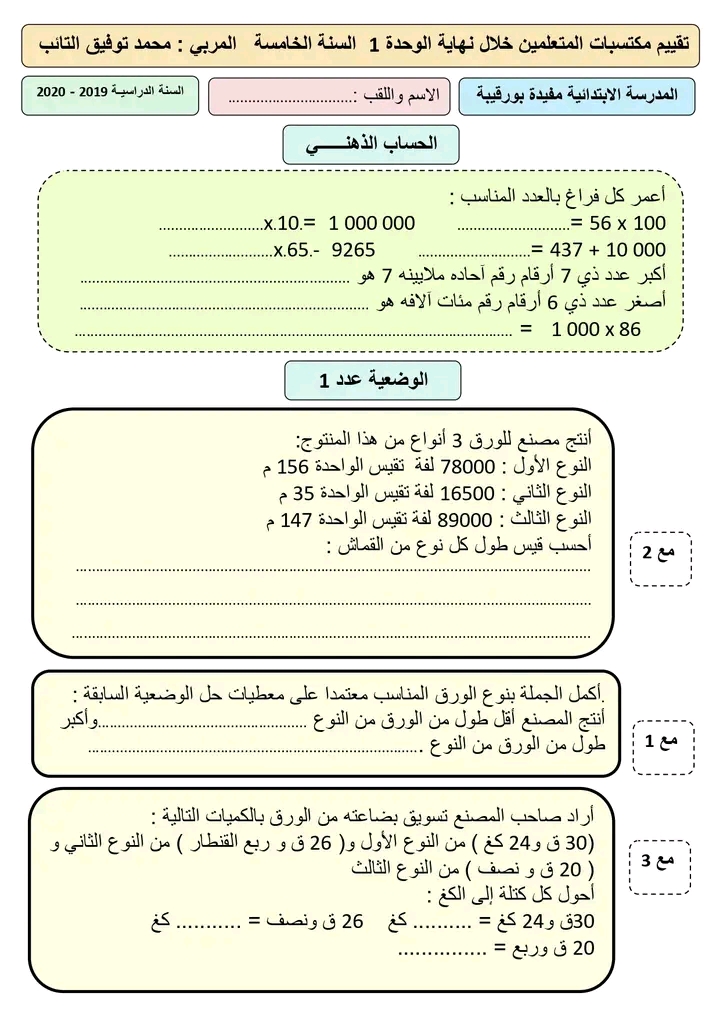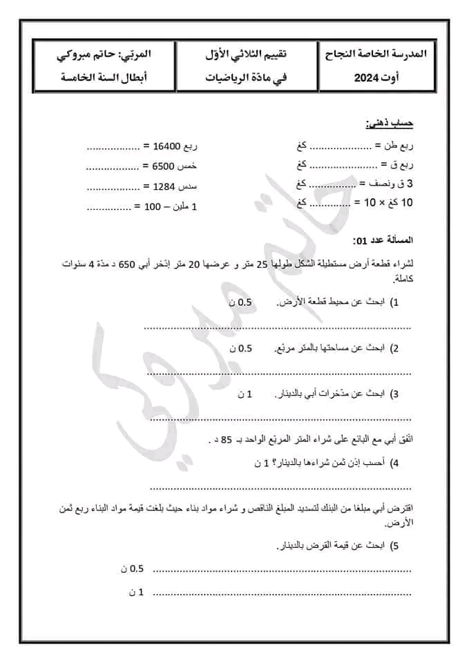 تقييم رياضيات الثلاثي الأول سنة خامسة