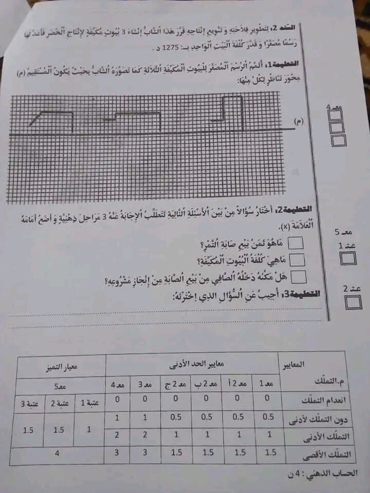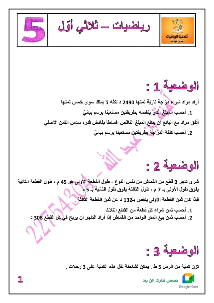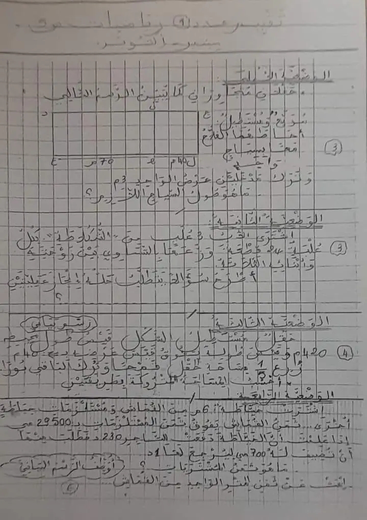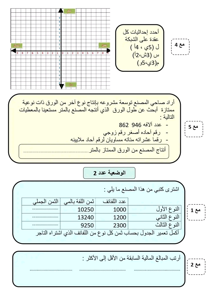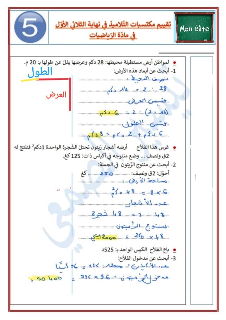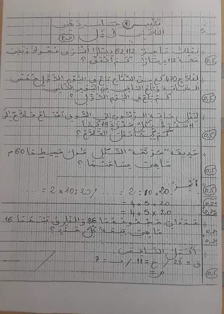 تقييم رياضيات الثلاثي الأول سنة خامسة