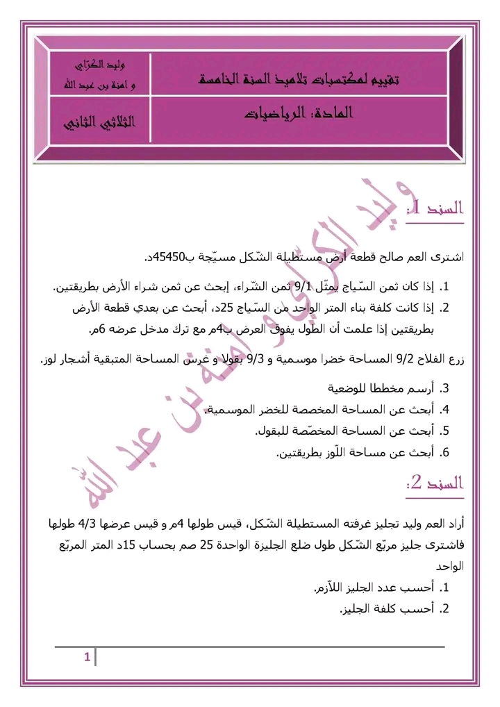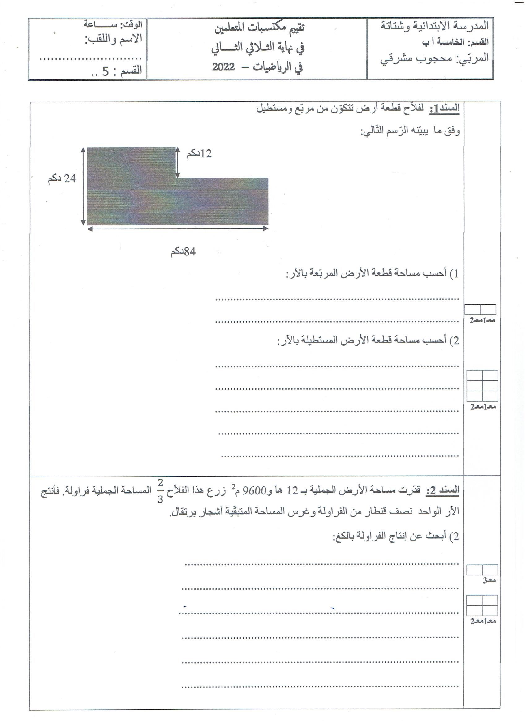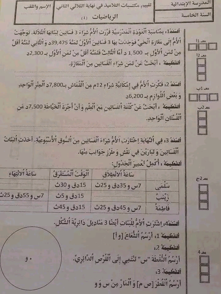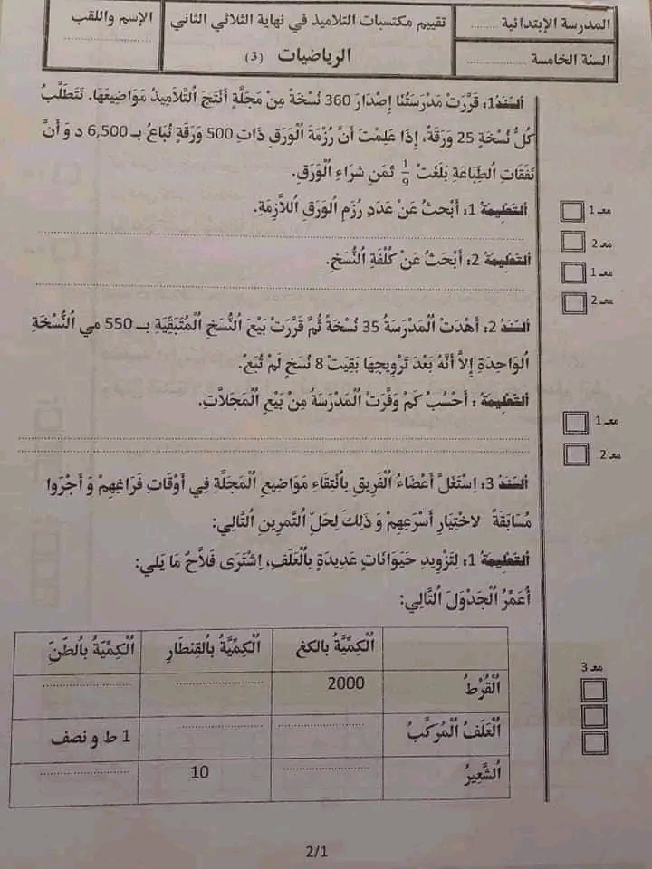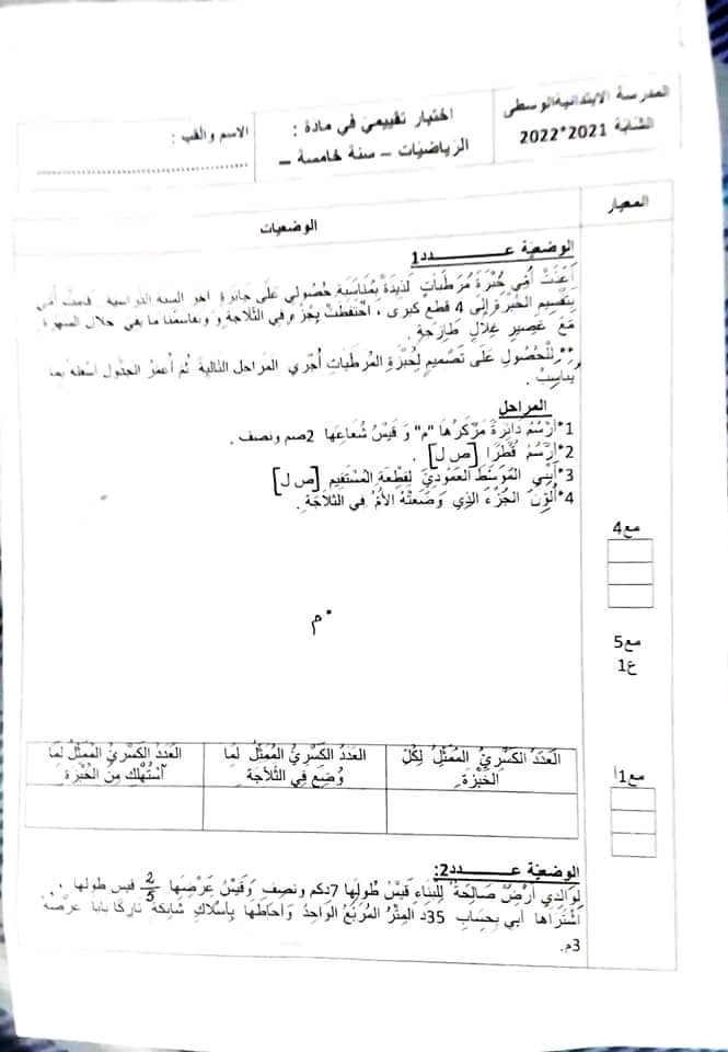 تقاييم رياضيات الثلاثي الثاني سنة خامسة