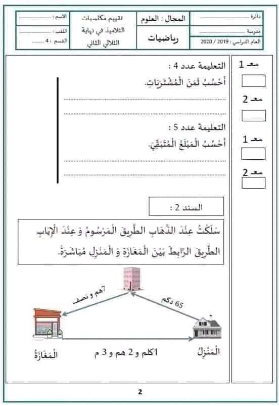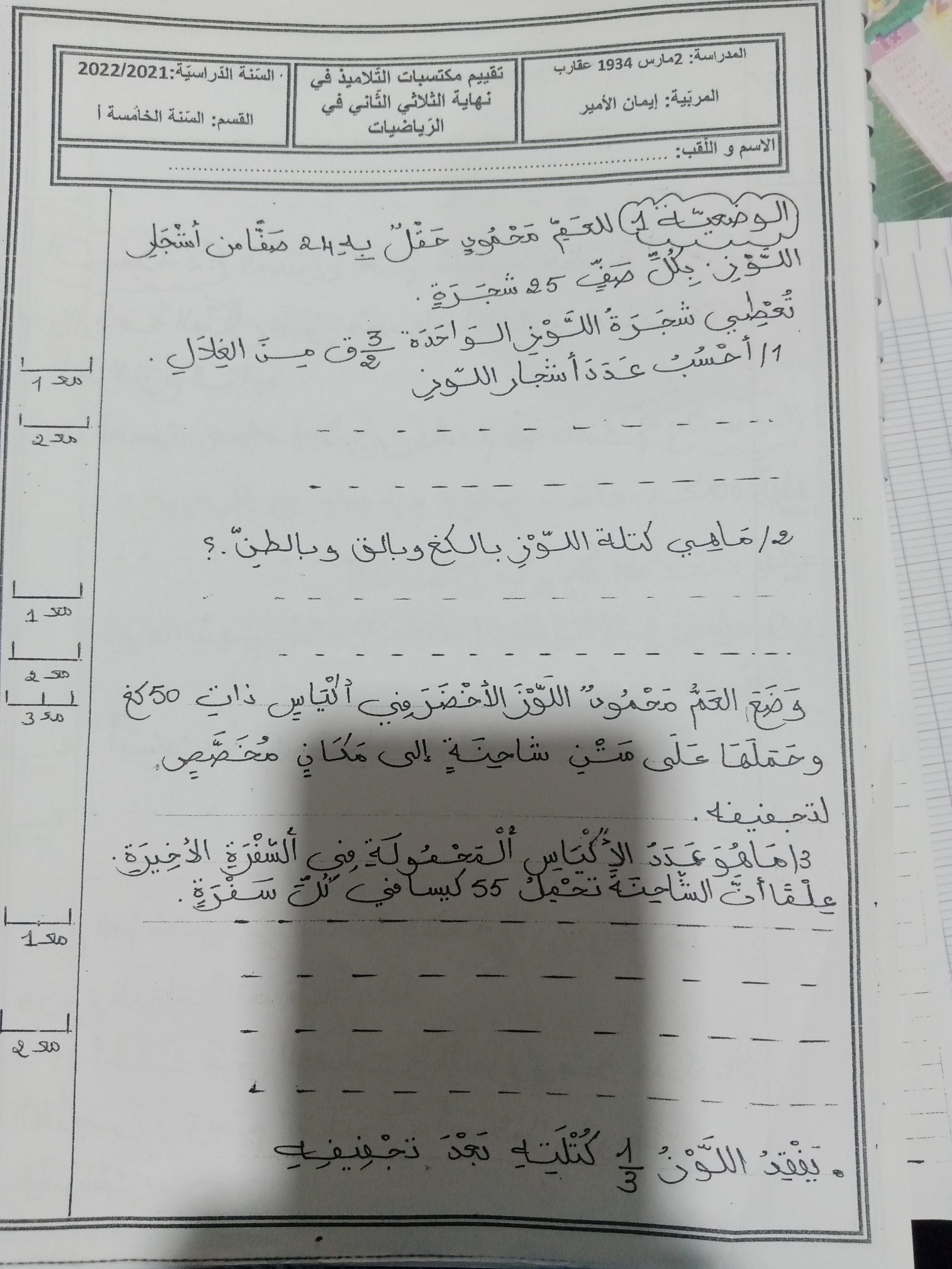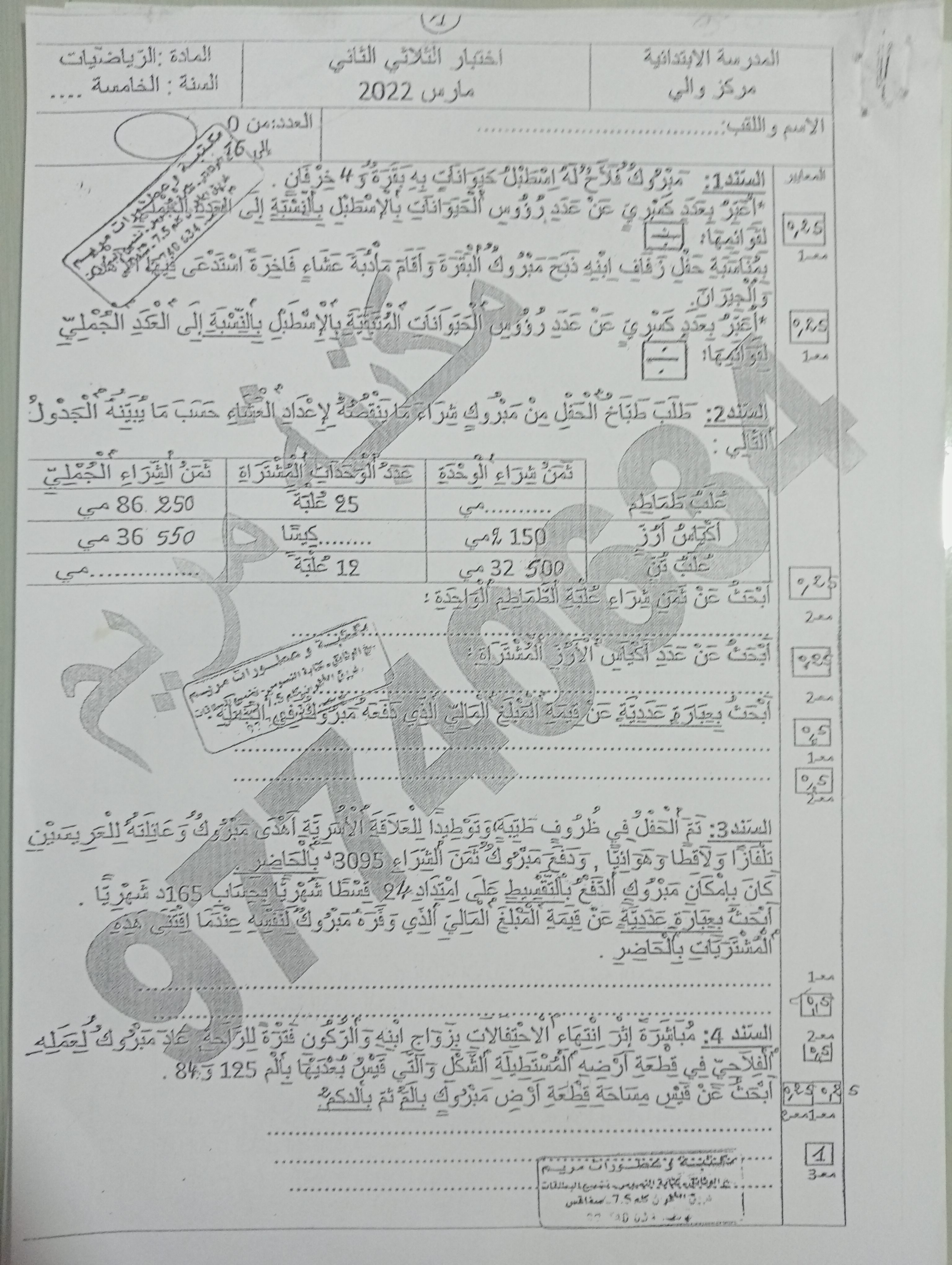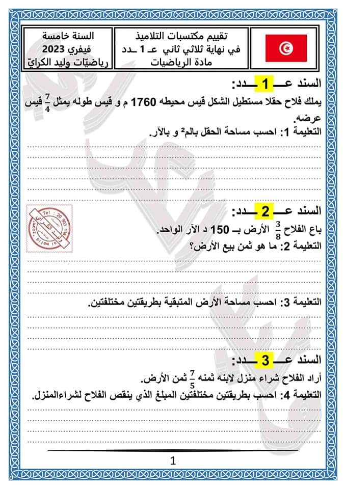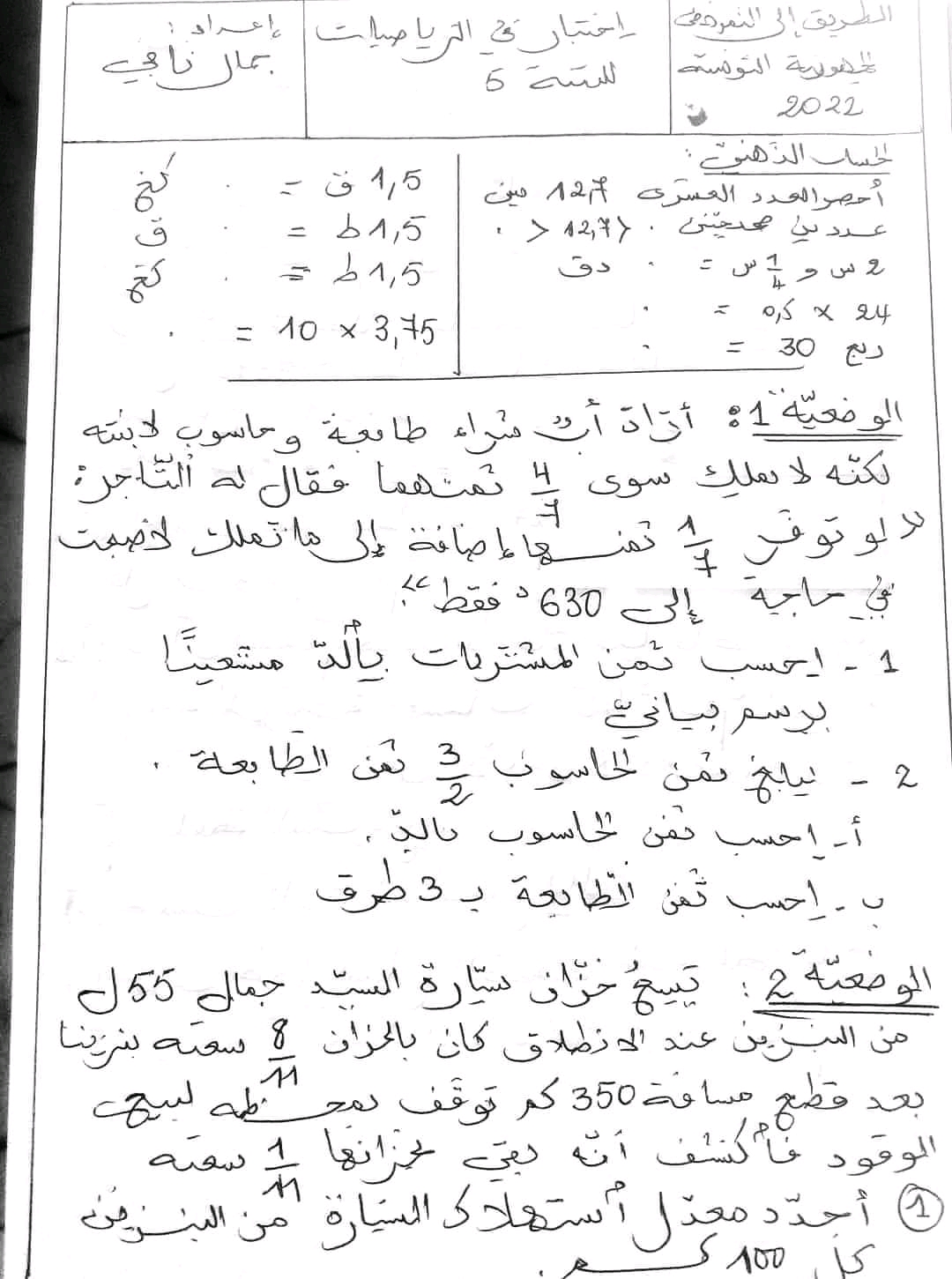 تقاييم رياضيات الثلاثي الثاني سنة خامسة
