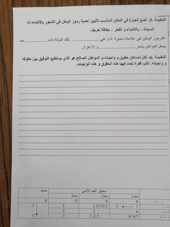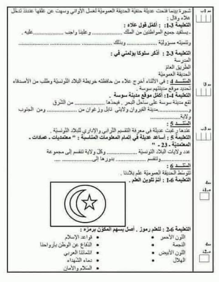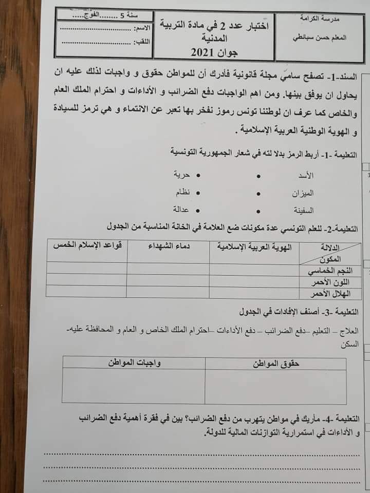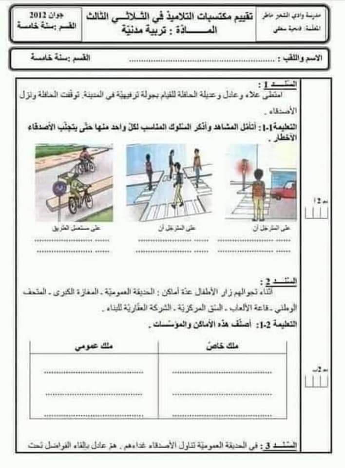 امتحانات تربية مدنية السنة الخامسة ثلاثي ثالث
