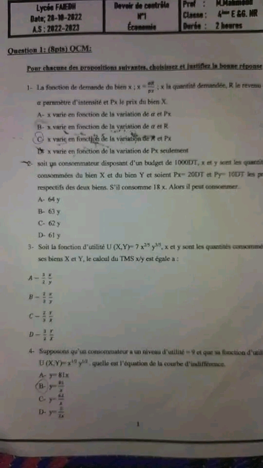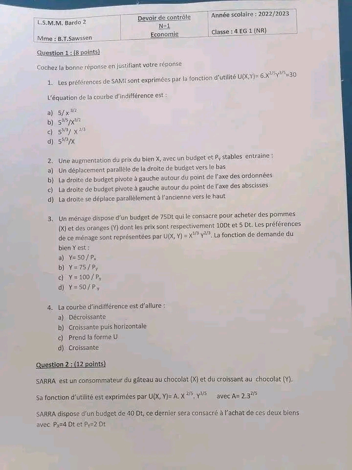 Devoir de contrôle N°1 Economie 📝