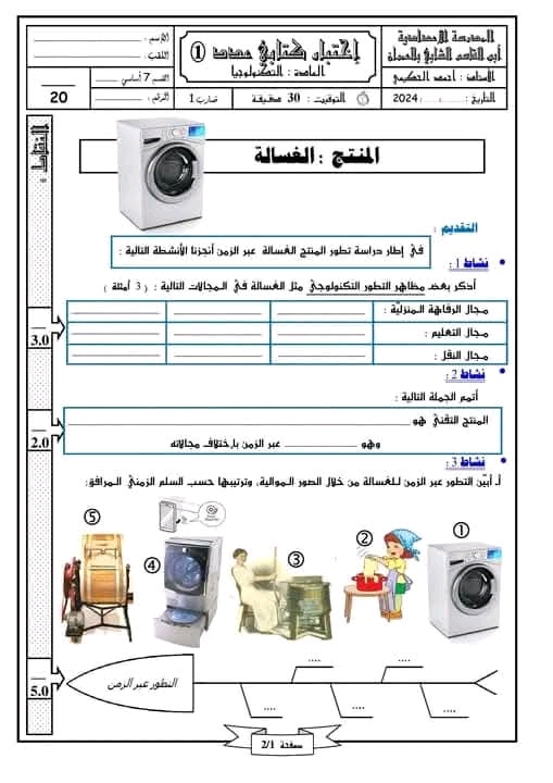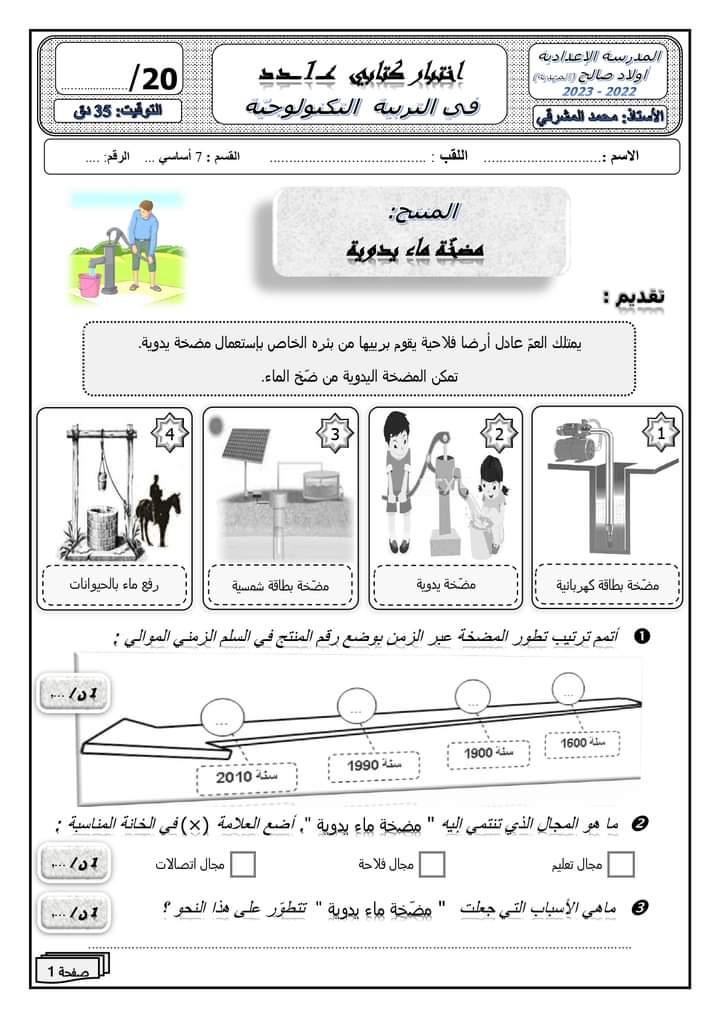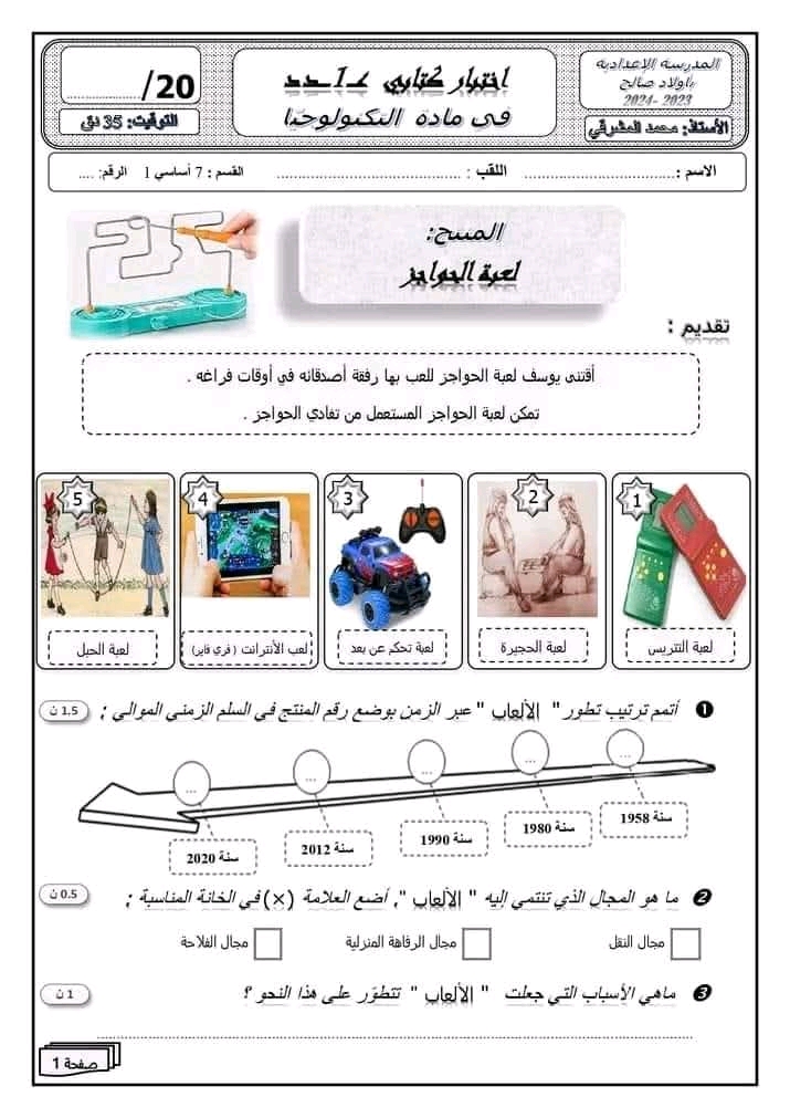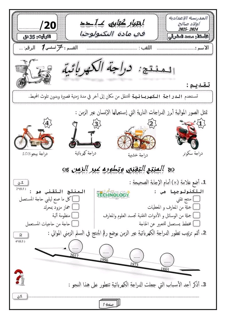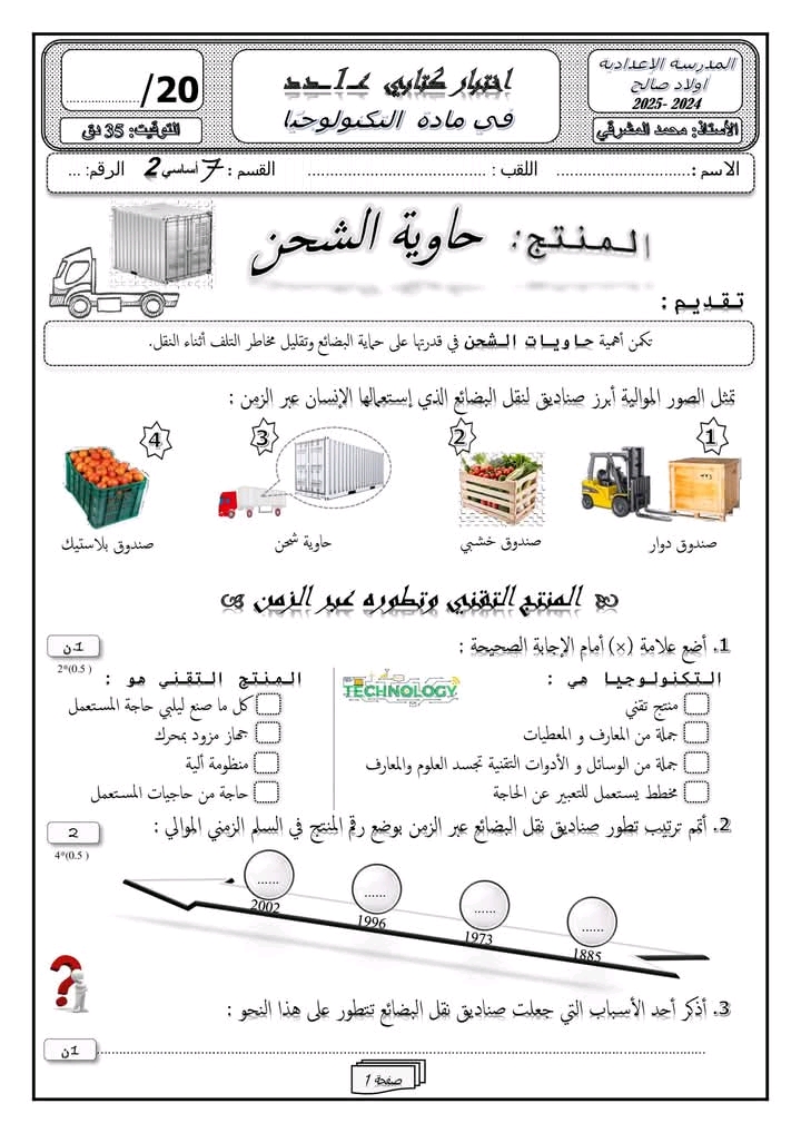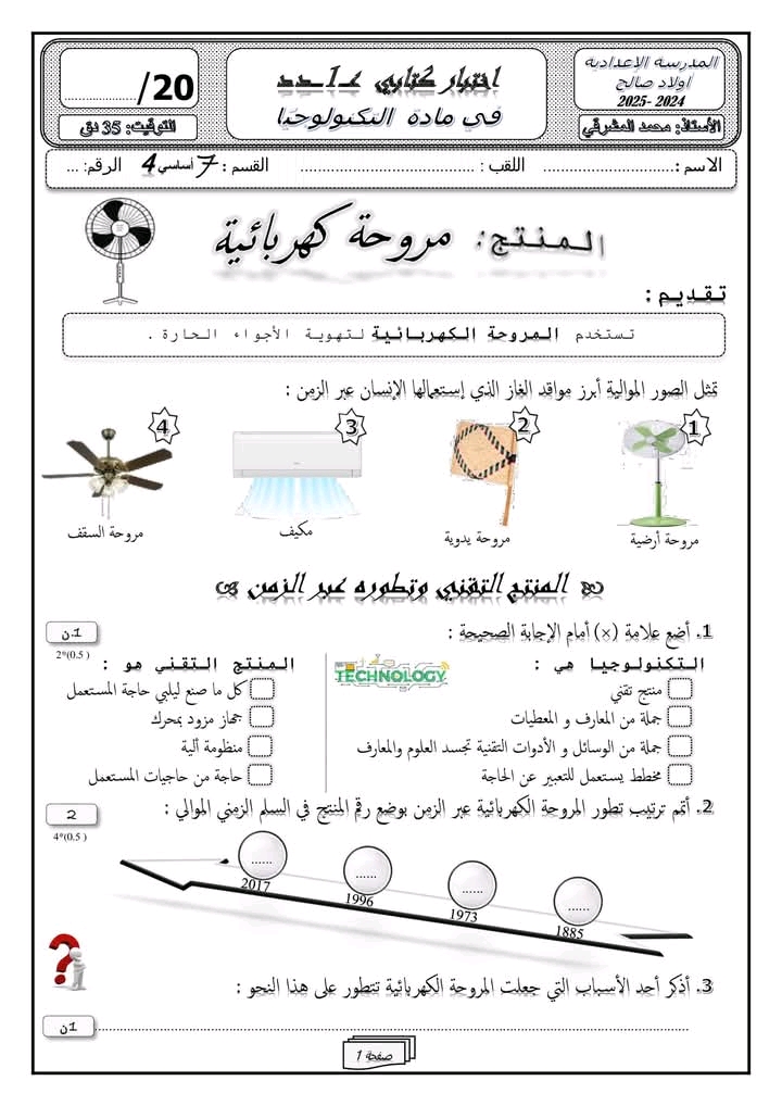 "إختبار كتابي عدد 1 لمادة التكنولوجيا"