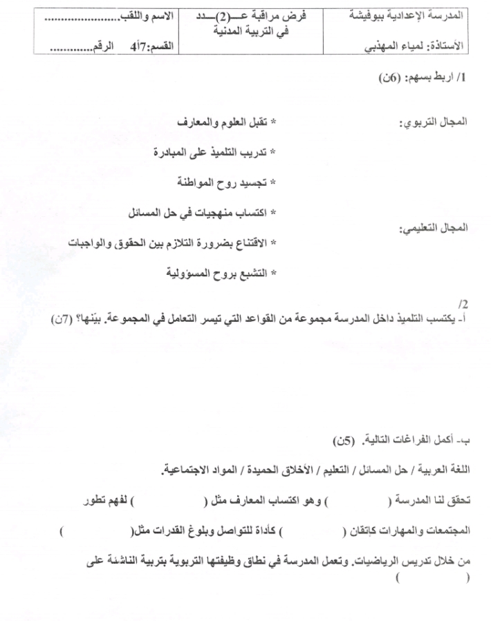 اختبار كتابي عدد 2 في مادة التربية المدنية