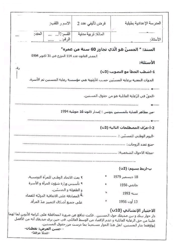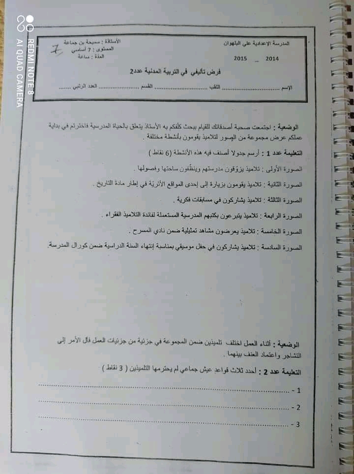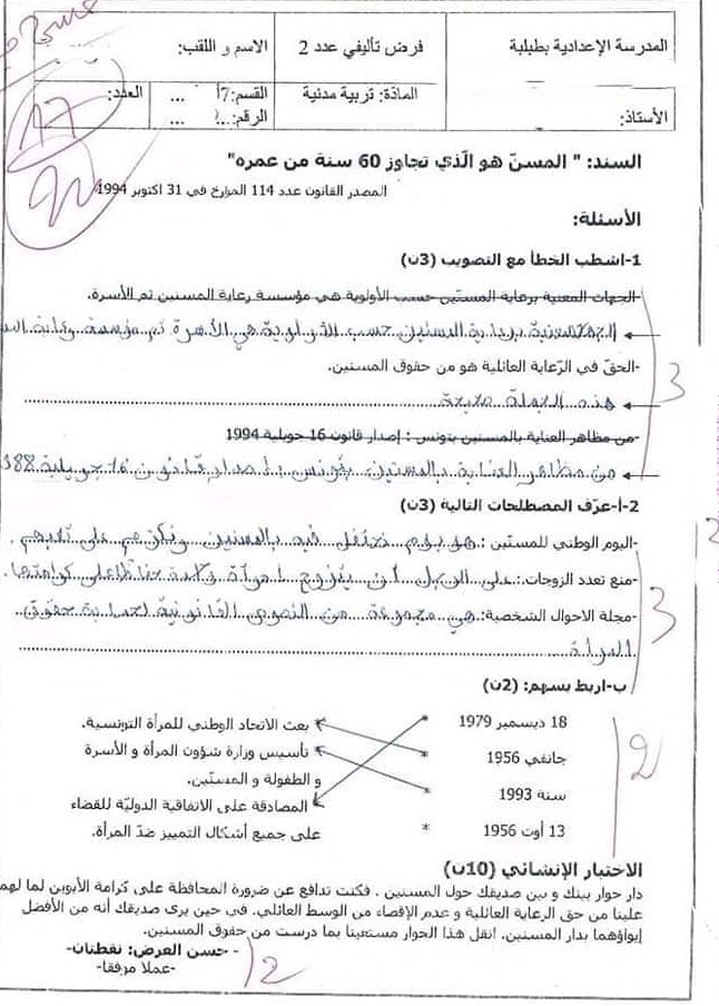 اصلاح فرض تأليفي عدد 2 تربية مدنية سابعة أساسي