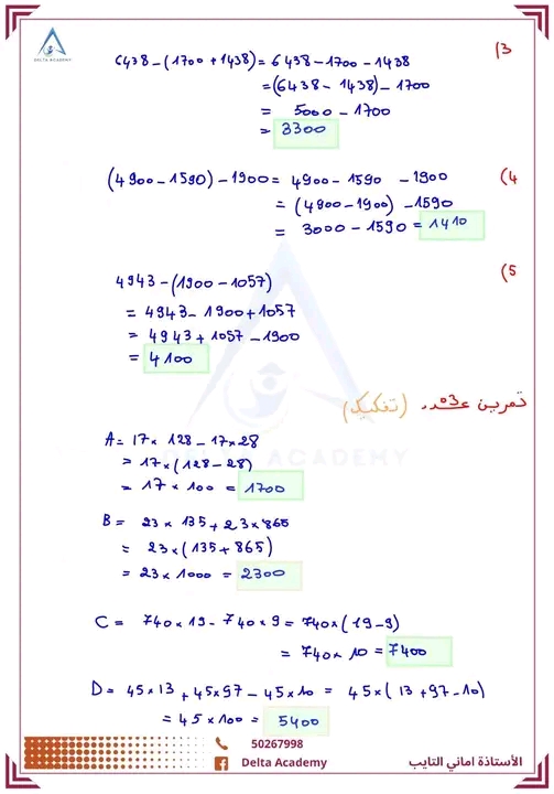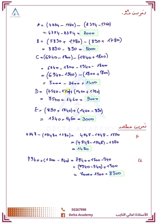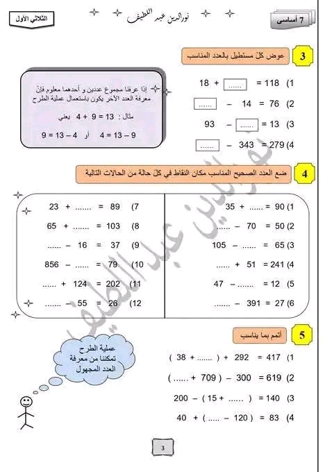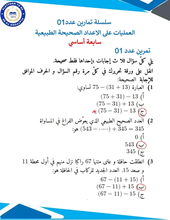 السنوات السابعة سلسلة تمارين العمليات على الاعداد الصحيحة الطبيعية
