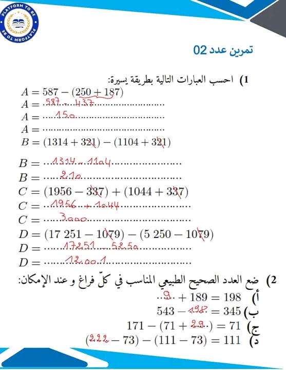 تمارين حول الأعداد الصحيحة الطبيعية