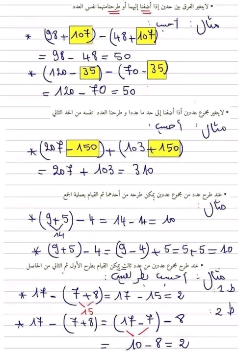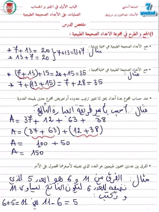 سابعة أساسي: ملخّص درس العمليات على الأعداد الصحيحة الطبيعية مع تمارين مرفقة بالاصلاح