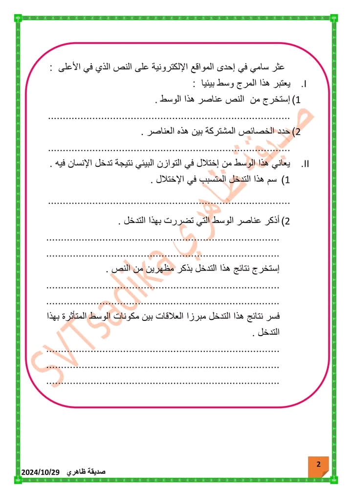 فرض مراقبة عدد 2 في مادة الحياة والأرض بالاصلاح