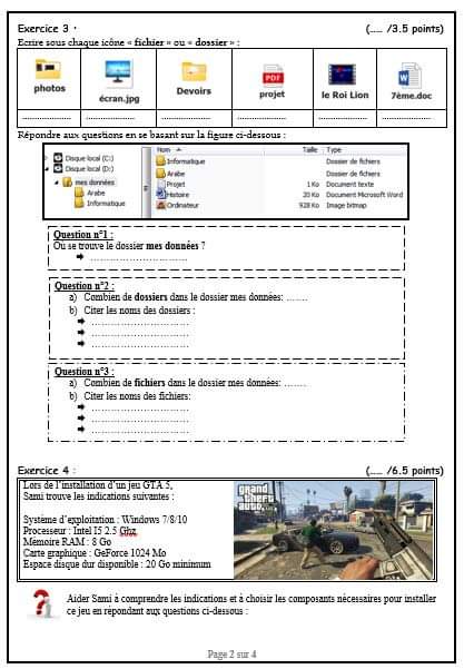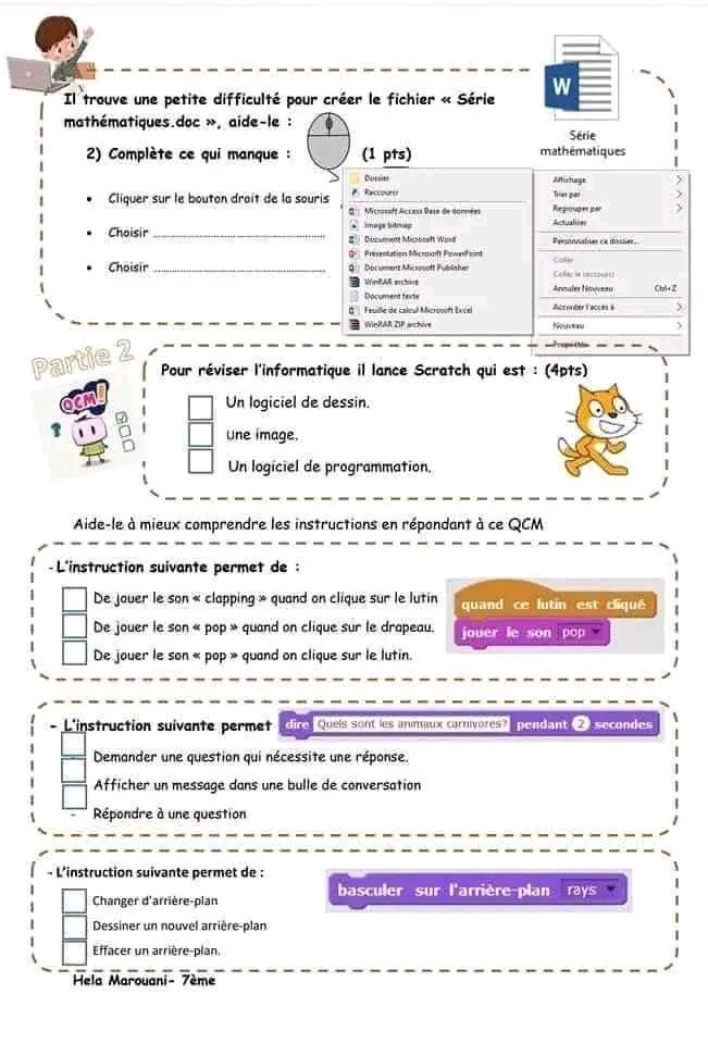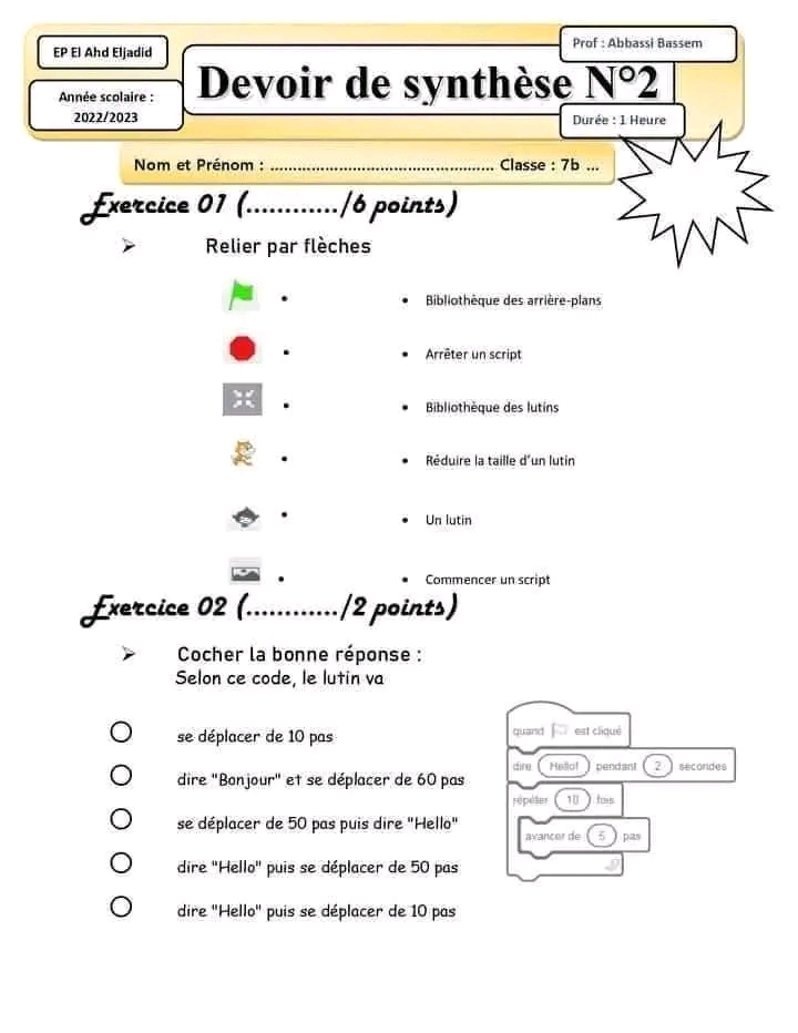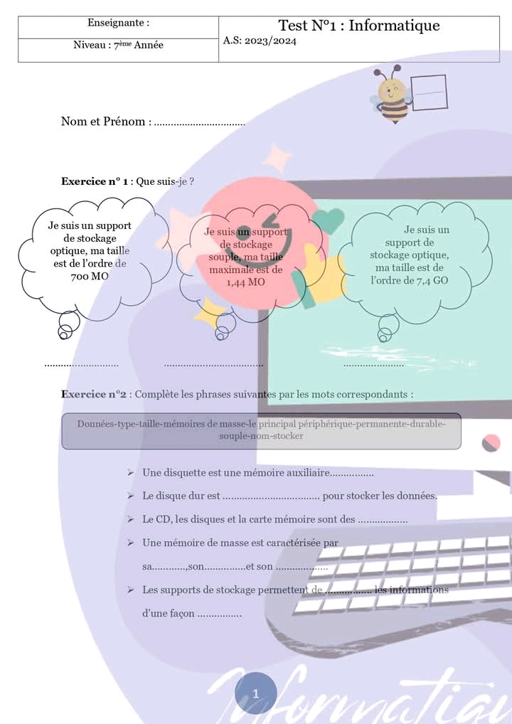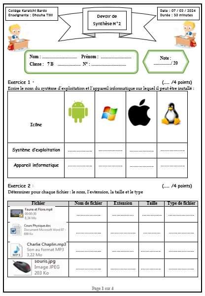 📘 **فرض مراقبة وتأليفي في informatiqueا – السنة 7 أساسي – الثلاثي الأوّل**