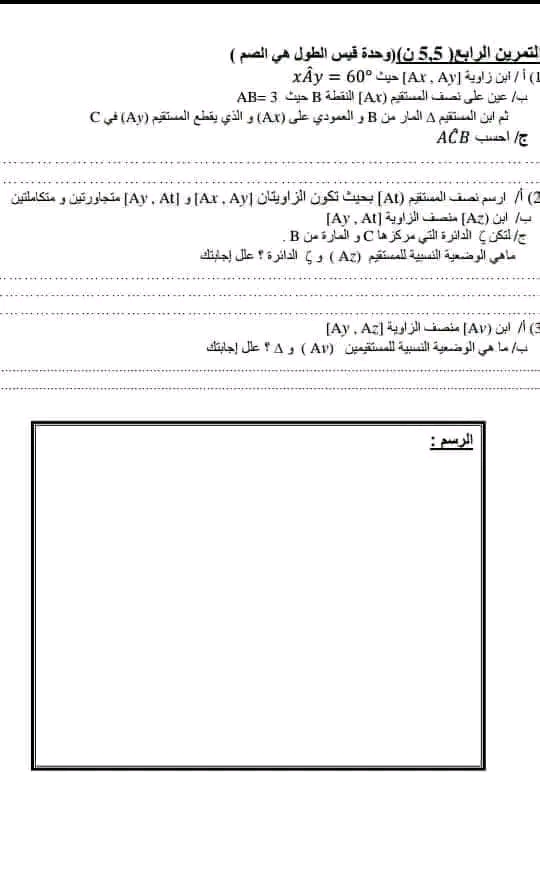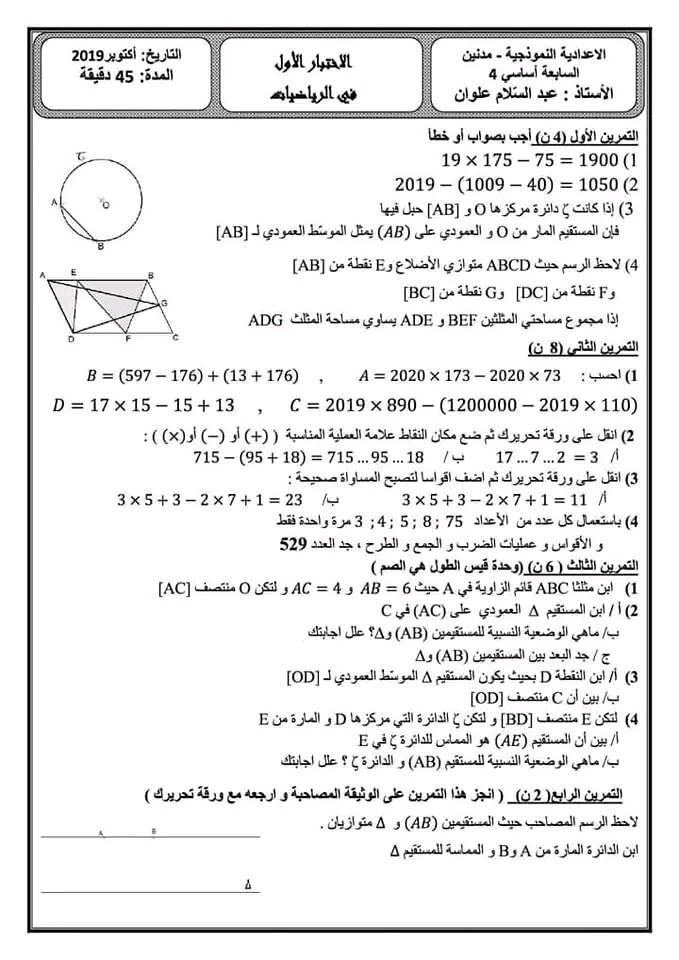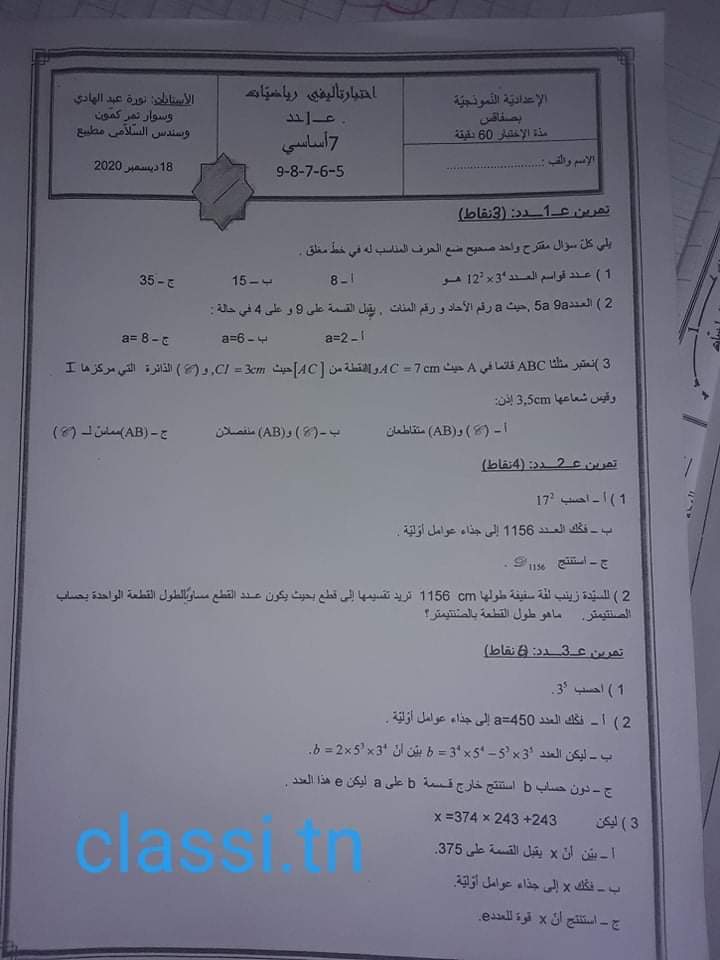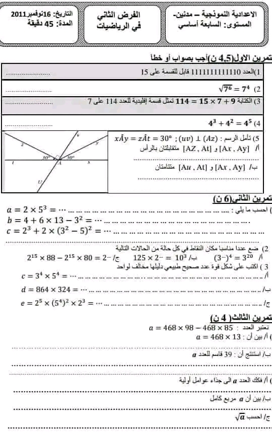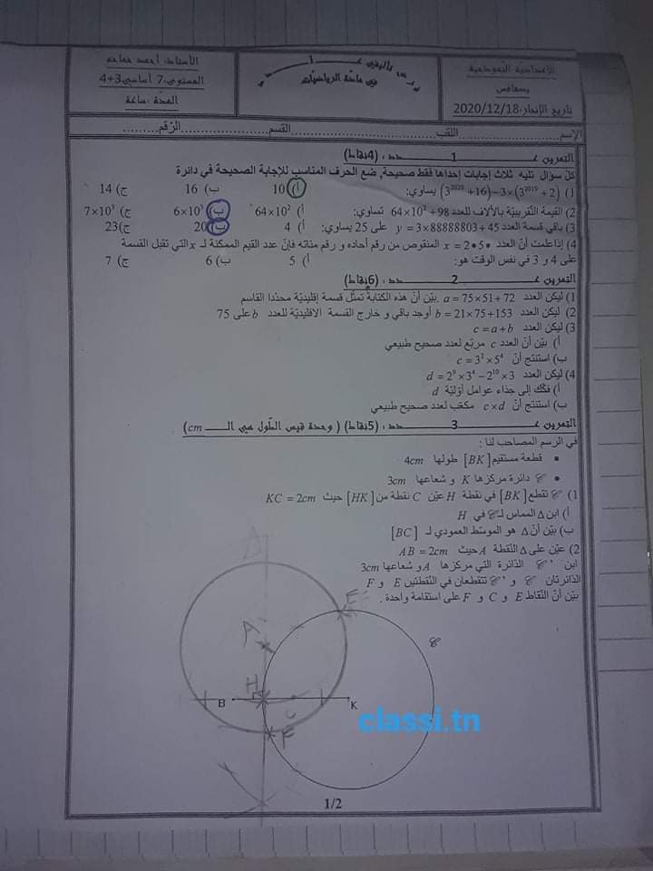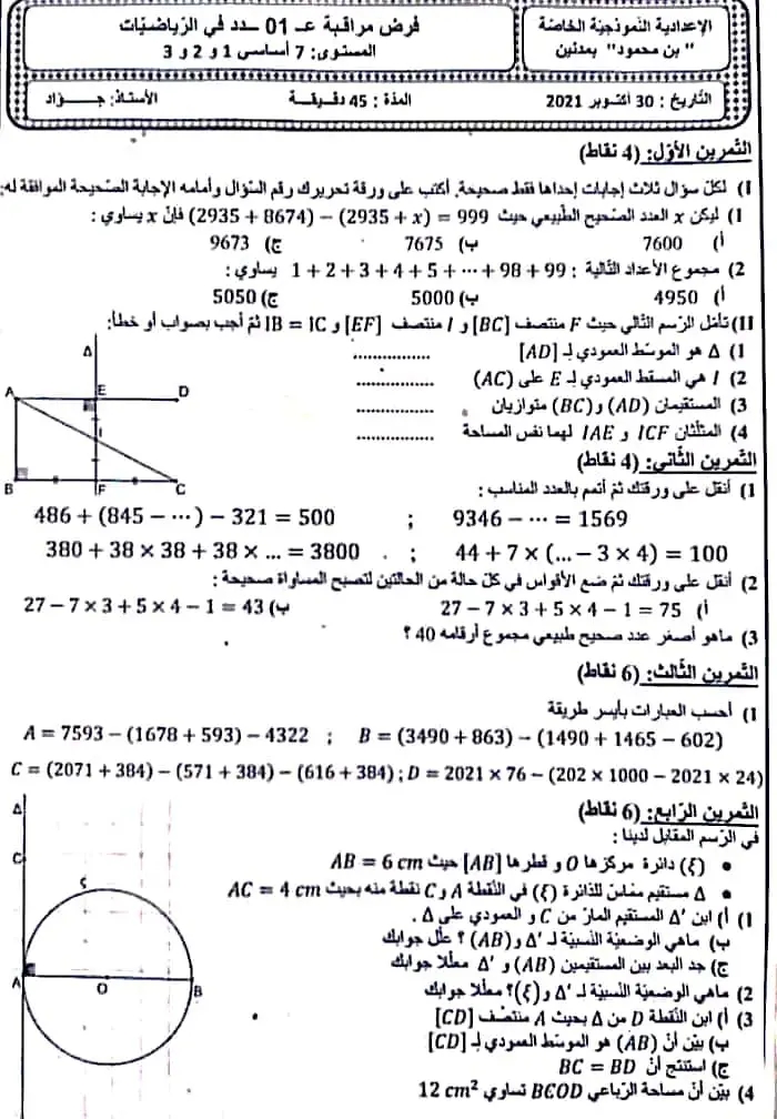 فرض مراقبة رياضيات عدد 01 مرفق بالاصلاح