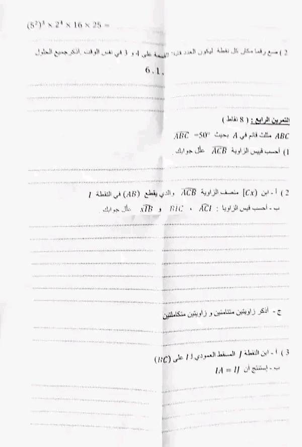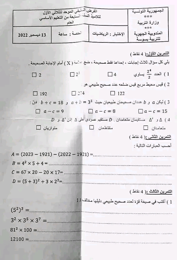 الفرض التأليفي الموحد الأول في الرياضيات للسنوات السابعة نموذجي بقابس.