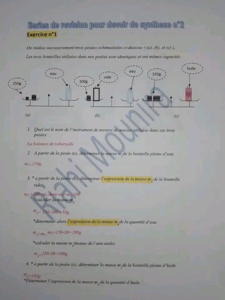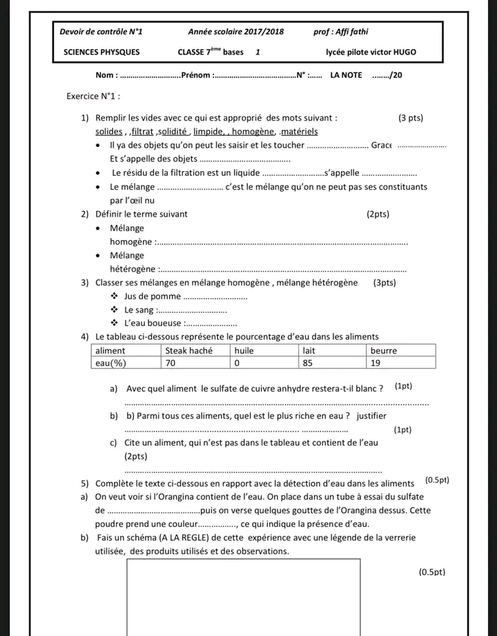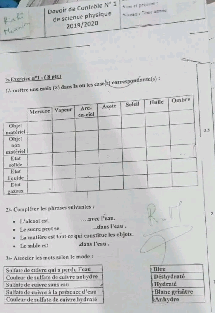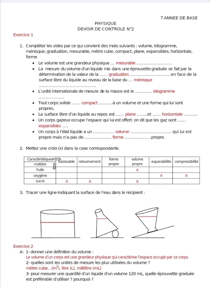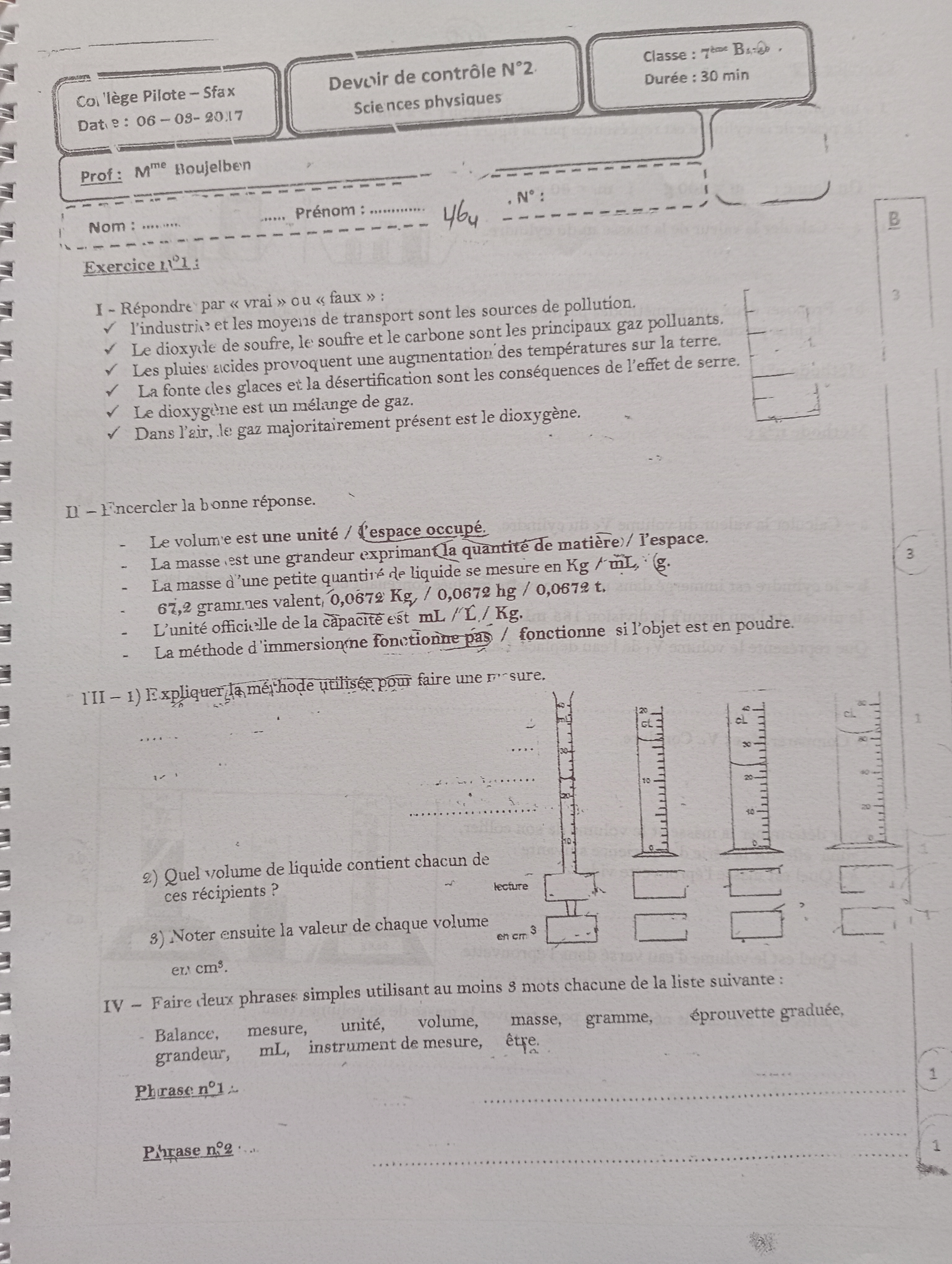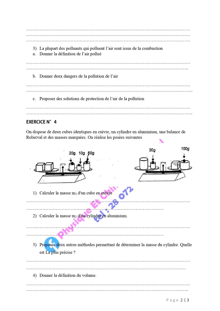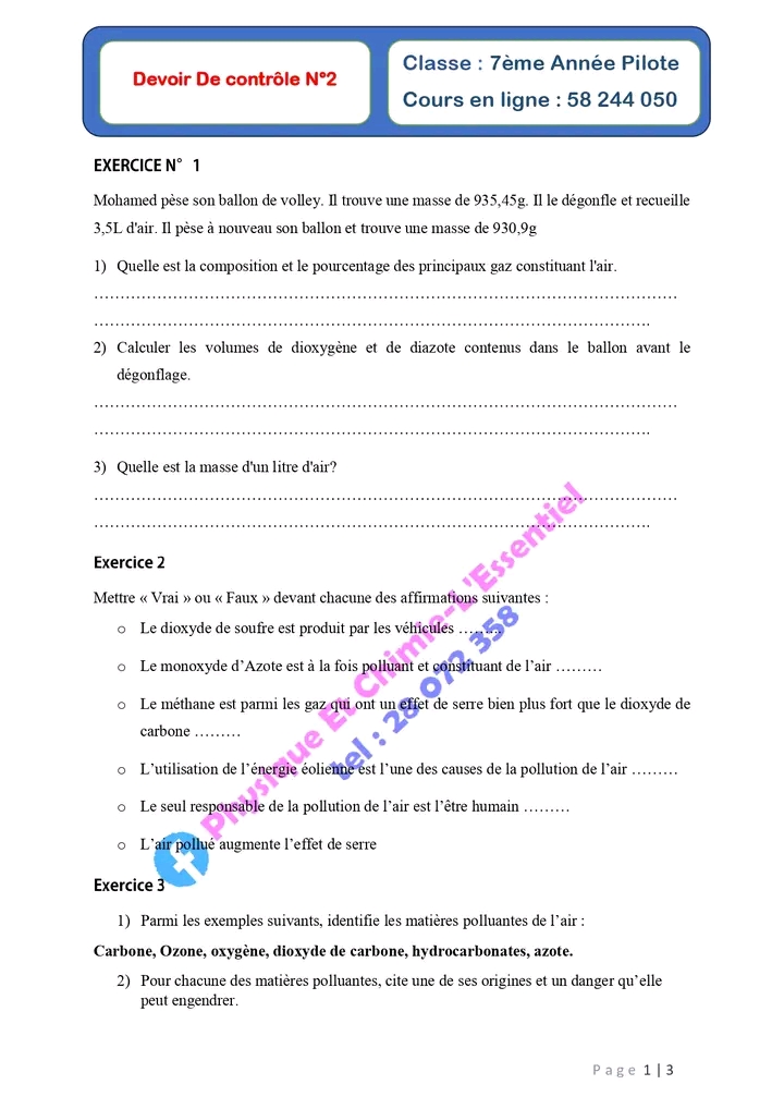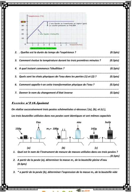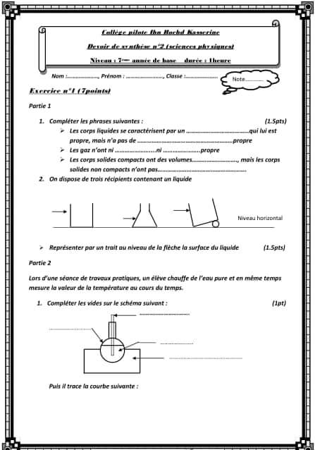 Devoir de synthèse n 3 sciences physiques 7ème année pilote