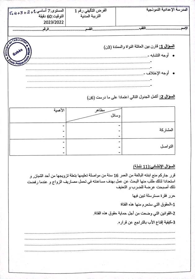 الفرض التأليفي عدد 1 في التربية المدنية للسنوات 7 نموذجي بقابس . إنجاز أستاذنا الفاضلة السيدة: أحلام شمام .