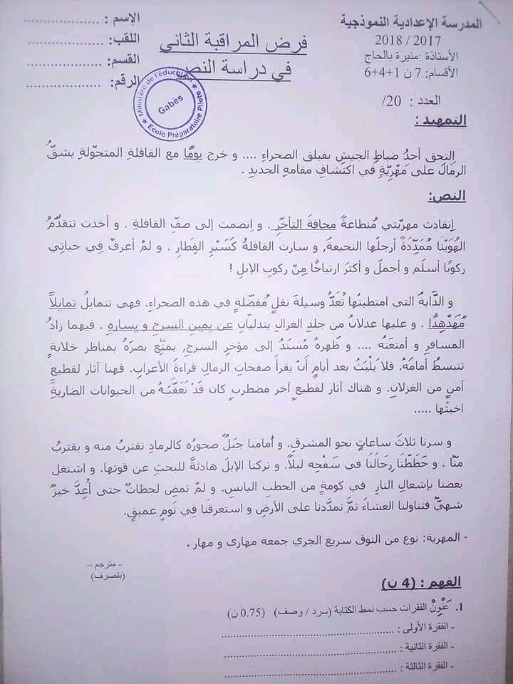 فرض مراقبة عدد 2 دراسة نص سنة سابعة اساسي تموذجي