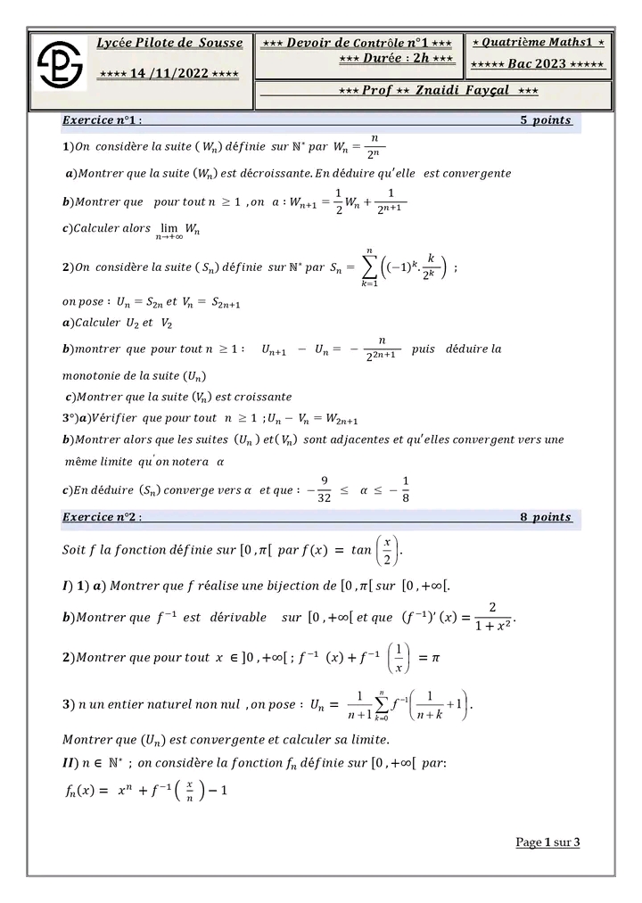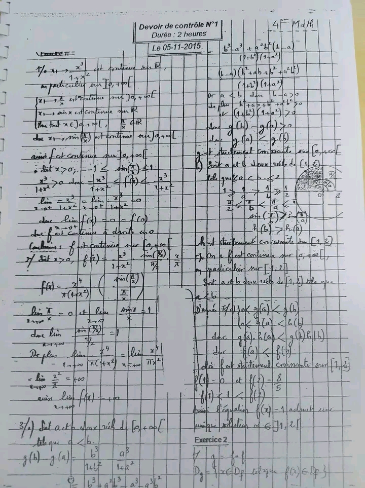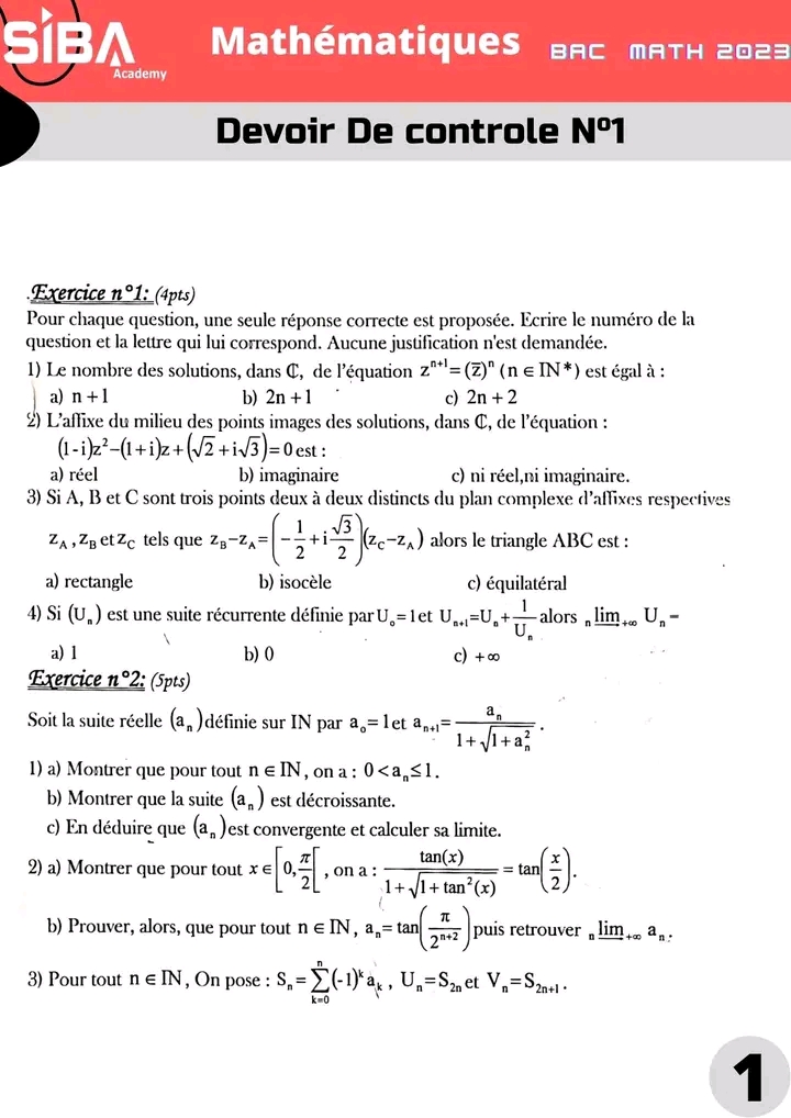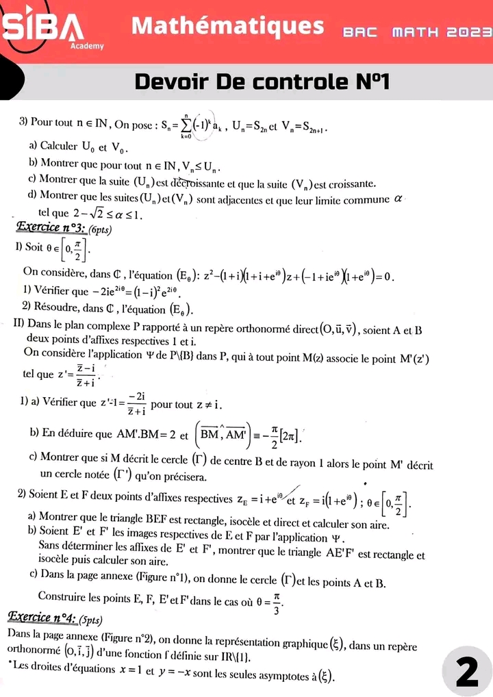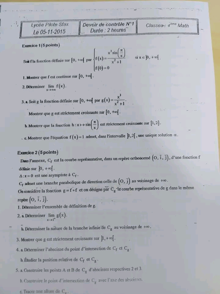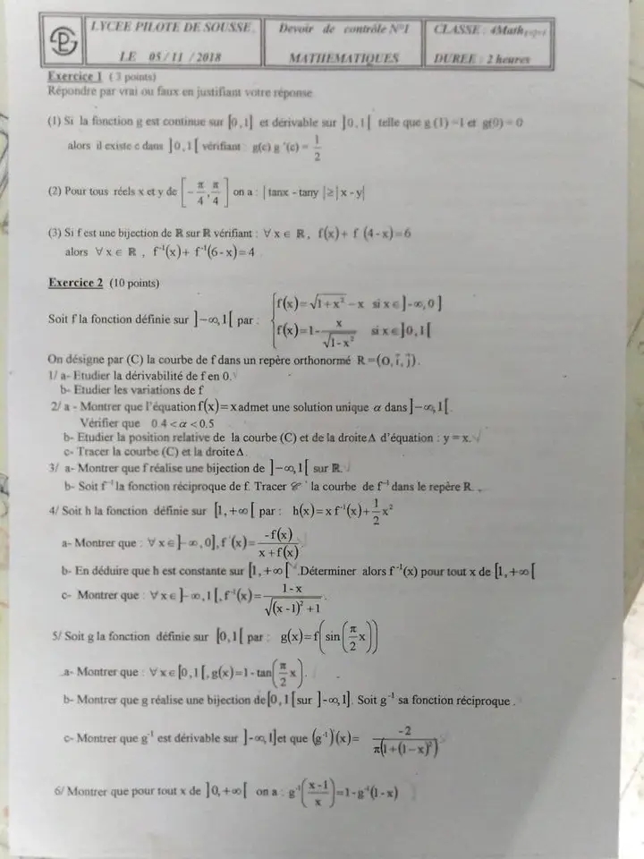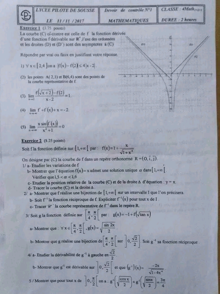 Deux devoirs.de contrôle nr 1 corrigés bac math .. lycée pilote menzah8