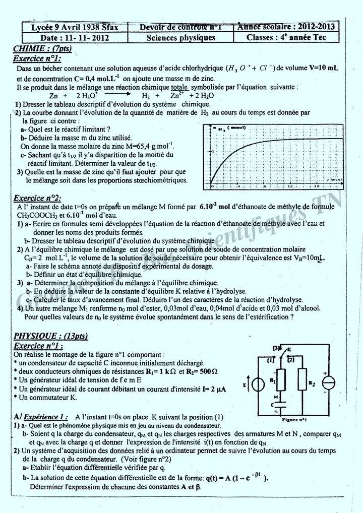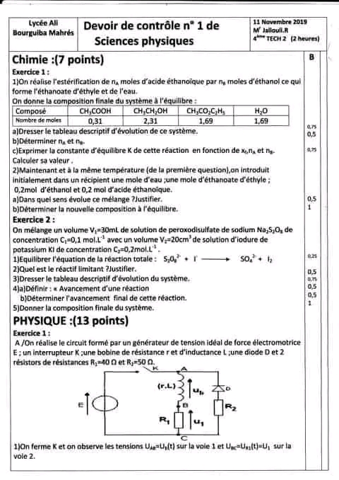 Devoir de Contrôle N°1 Avec correction- Sciences physiques - Bac Technique