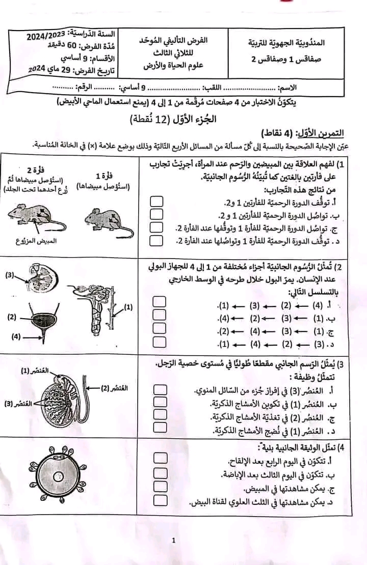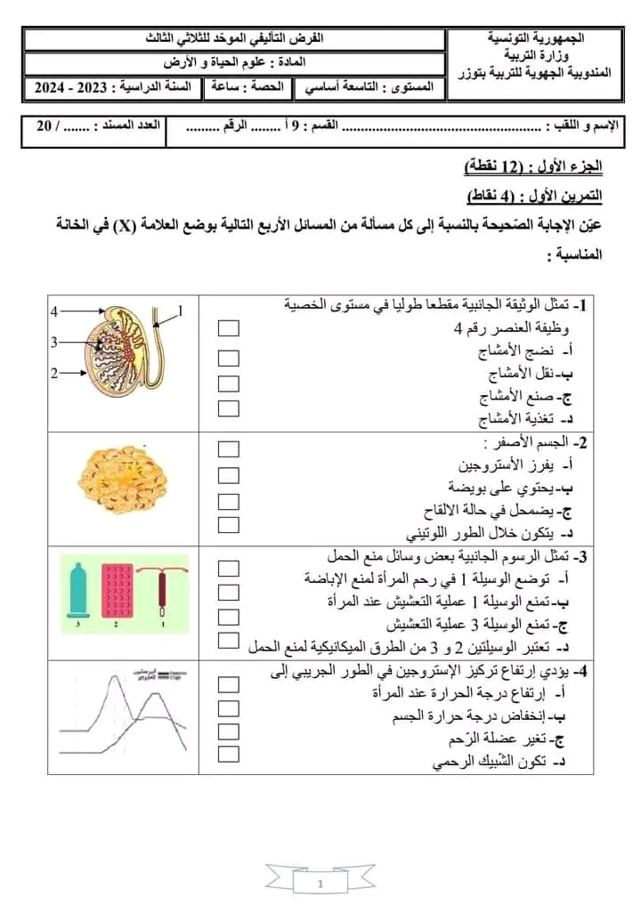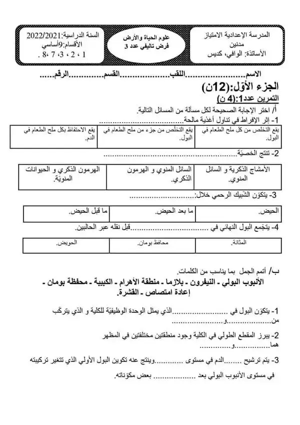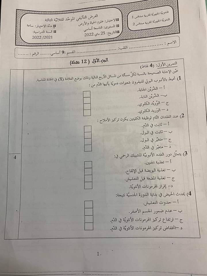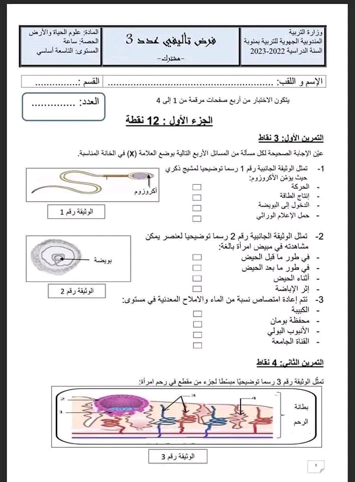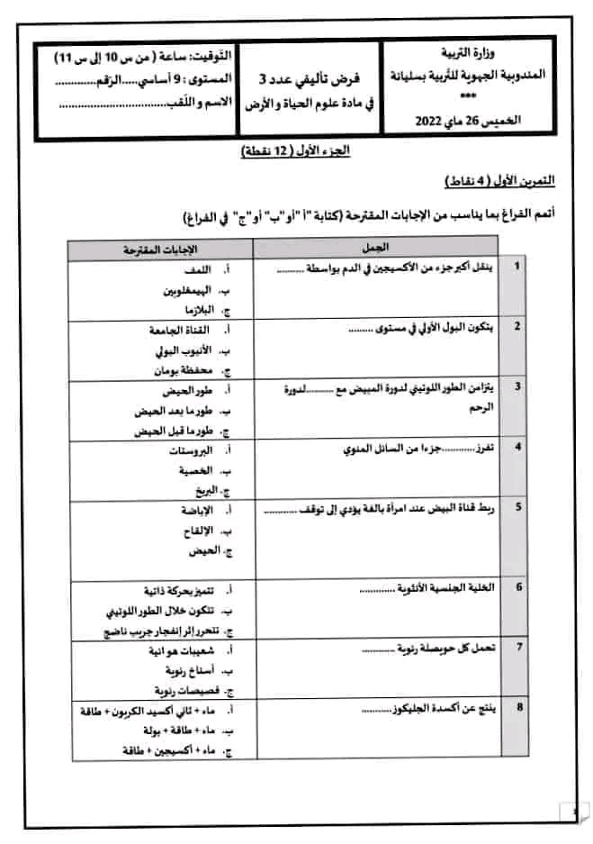 الفرض التاليفي علوم الأرض و الحياة 3 موحد سليانة 2022