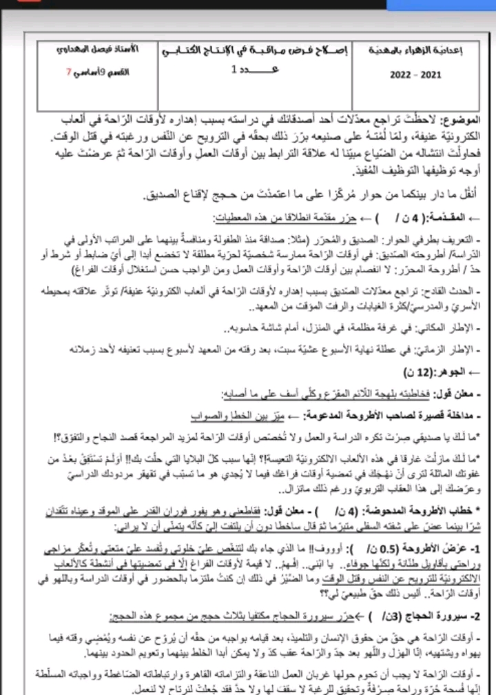 تدريب على فرض تأليفي عدد 1 سنة 9 أساسي