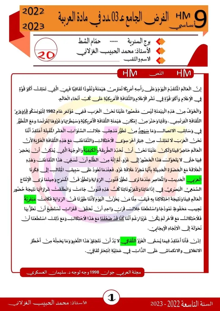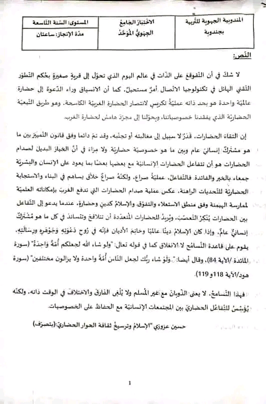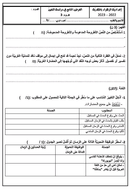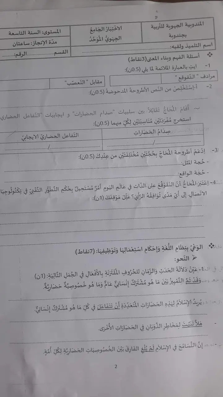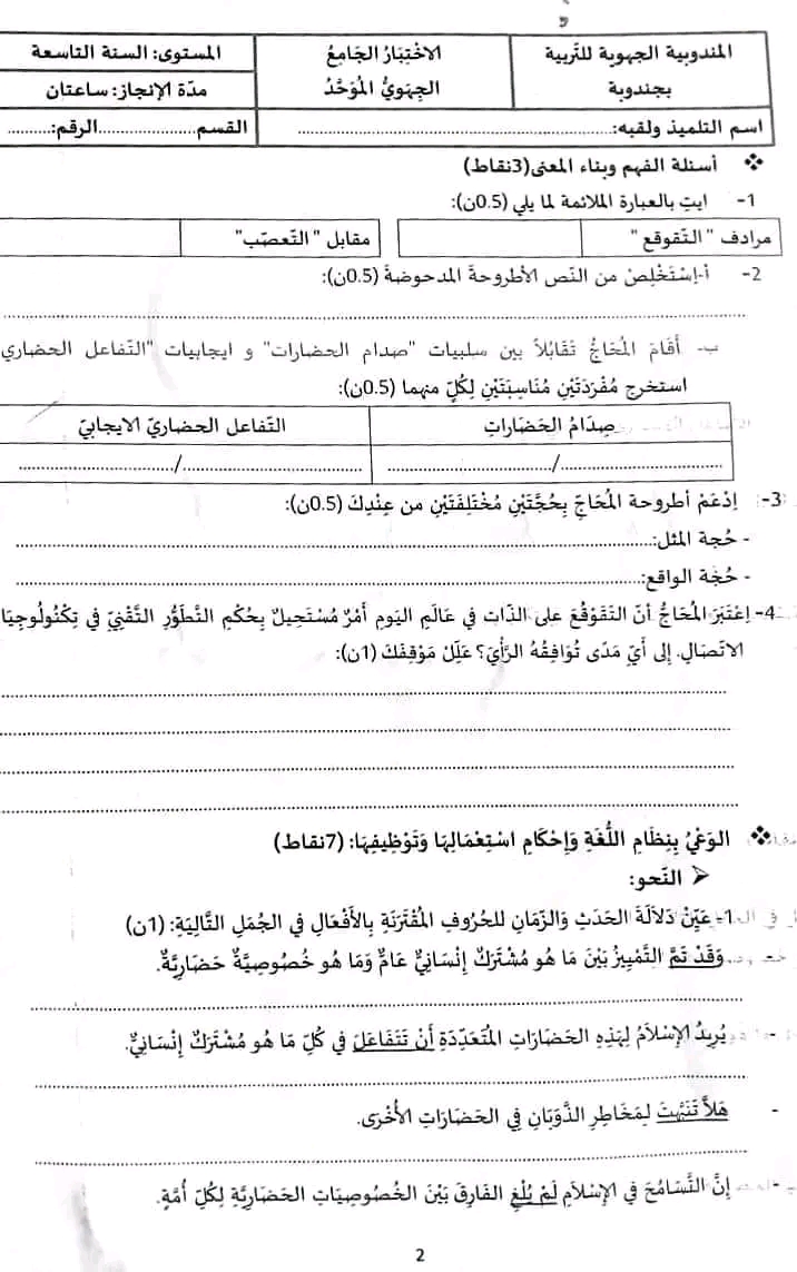 الفرض الجامع عدد 3 مع الإصلاح / محور تفاعل الثقافات / إعداديّة الزهراء بالمهديّة