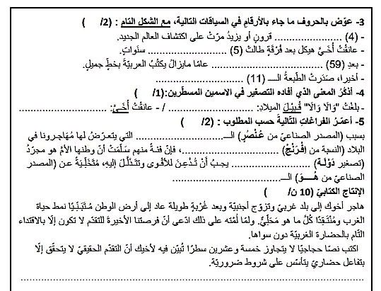 الاختبار الجامع الثالث في مادة العربية للسنوات التاسعة أساسيا ( مرفق بالإصلاح وبمقاييس إسناد الأعداد )