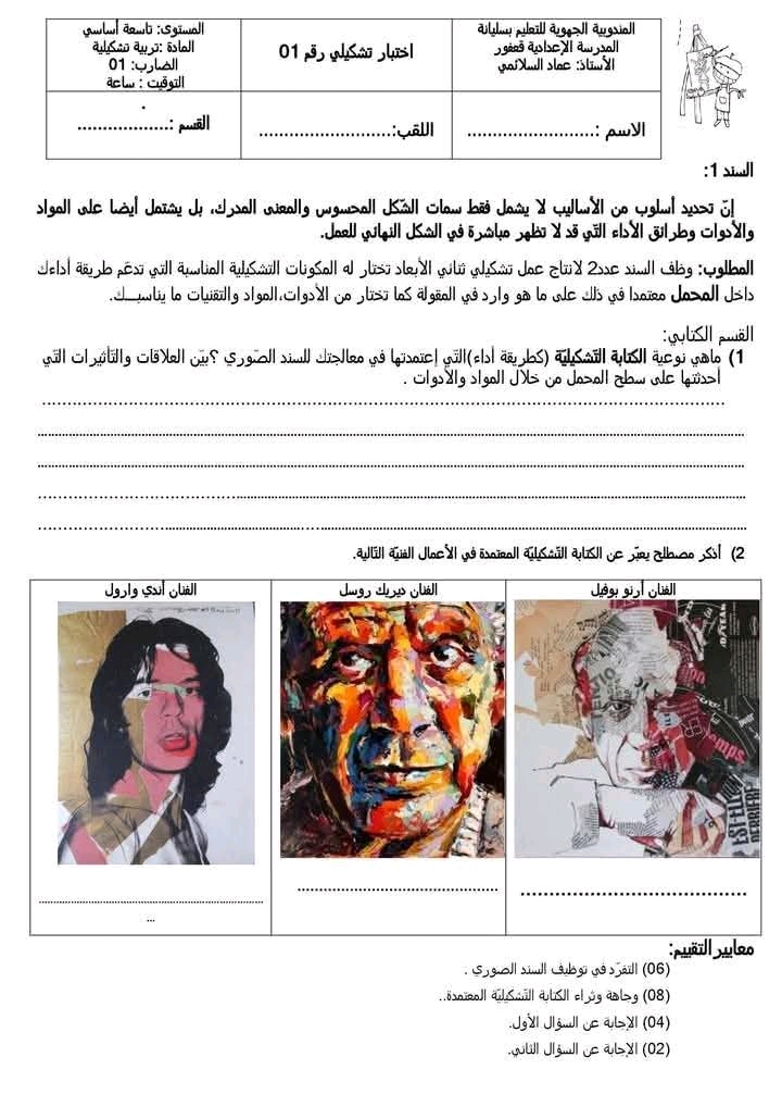 1. ماهي نوعية الكتابة التشكيلية كطريقة أداء التي اعتمدتها في معالجتك للسند الصوري؟ بين العلاقات والتأثيرات التي أحدثتها على سطح المحمل من خلال المواد والأدوات.