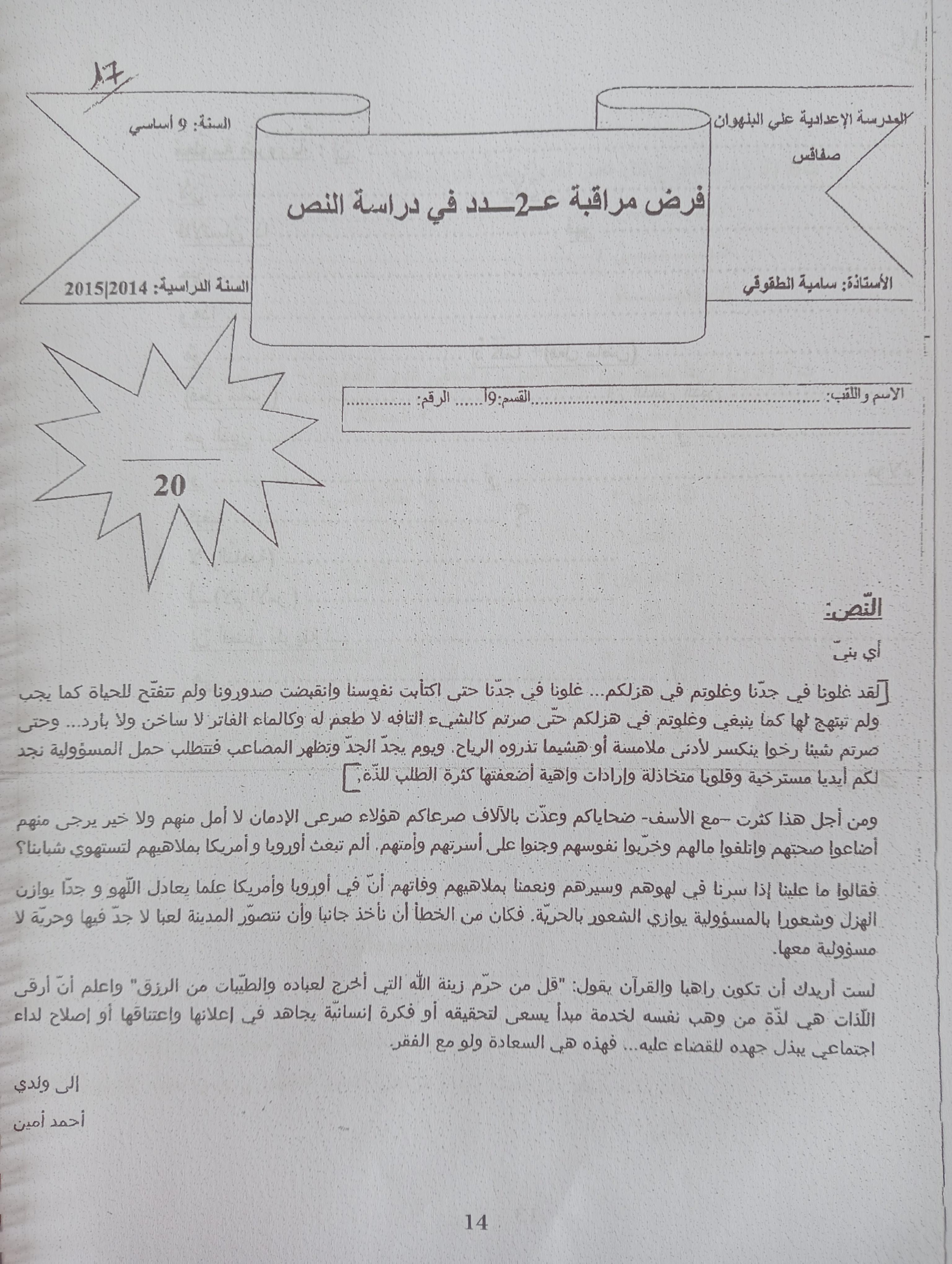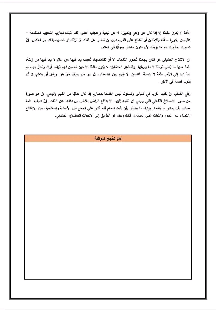 لم أستسلم, بل حاولت أن أقنعها أيضا بوجهة نظري فقلت: " لا جدال في أنّ ما تقولينه هو عين الصّواب ولكن ّ عملها في المجتمع لا يقلّ أهميّة , فهي بذلك تساهم في بنائه , لأنّ المجتمع السّليم كما قال "قاسم أمين": " لا يتنفّس برئة واحدة " وهو في نظر في نظر "نعيمة" "كالطّائر جناحاه الرّجل والمرأة " . وبالتّالي فمن واجبها أن تعمل."