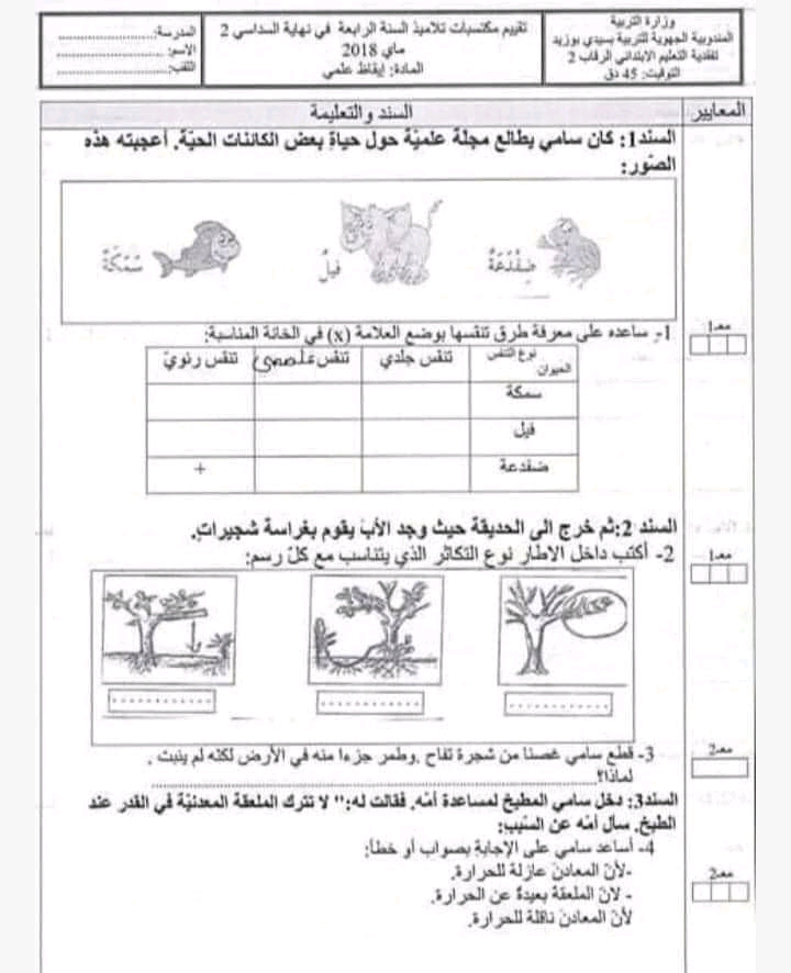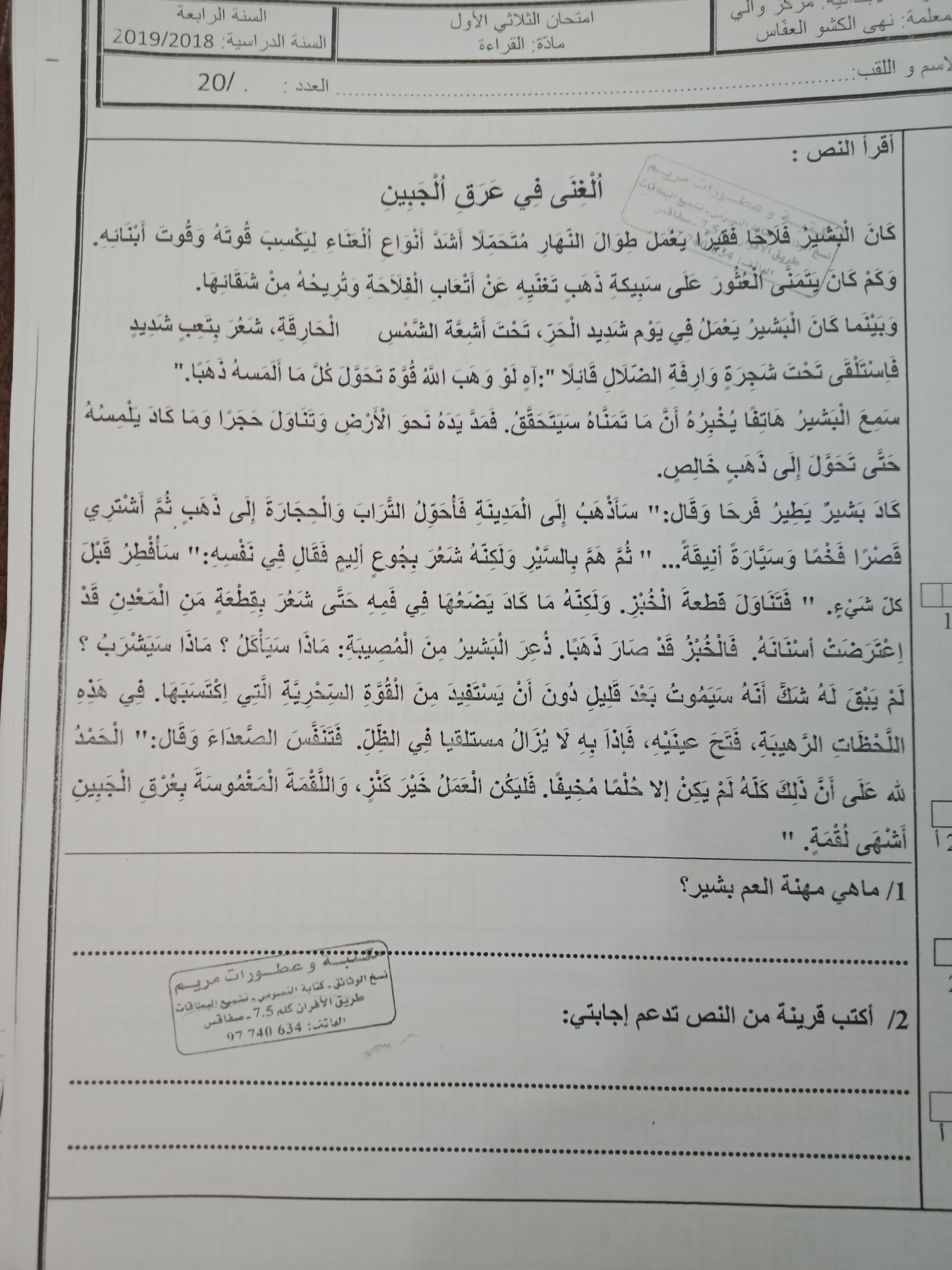 امتحانات قراءة وفهم سنة رابعة الثلاثي الأول