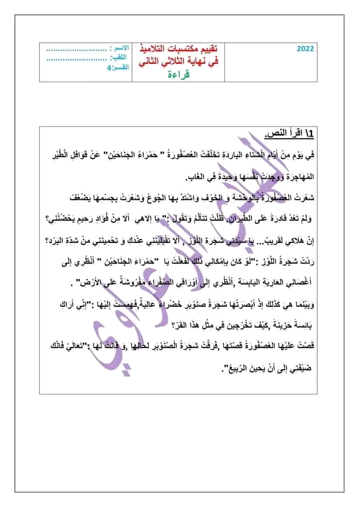 اختبار في مادة القراءة سنة رابعة ثلاثي ثاتي