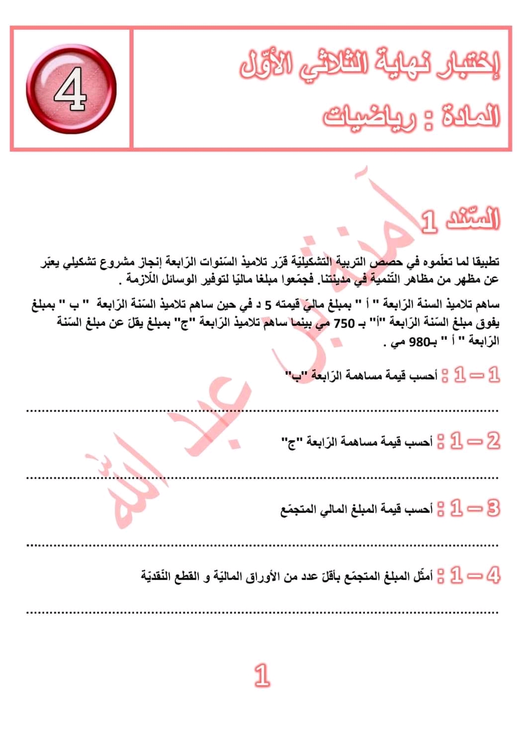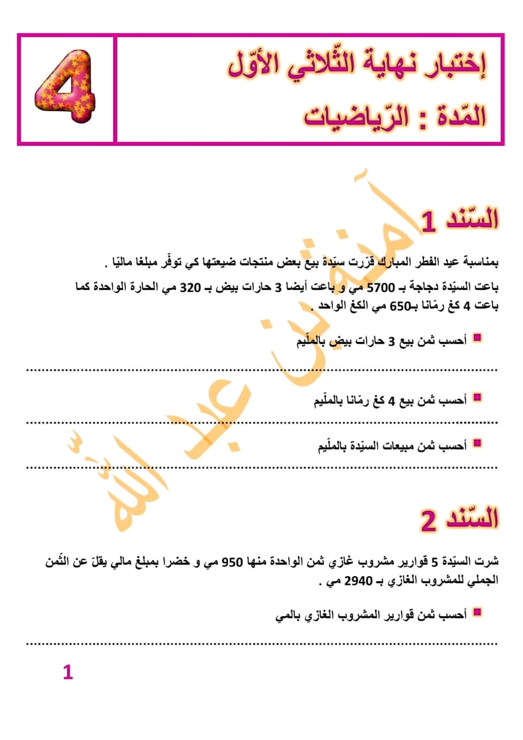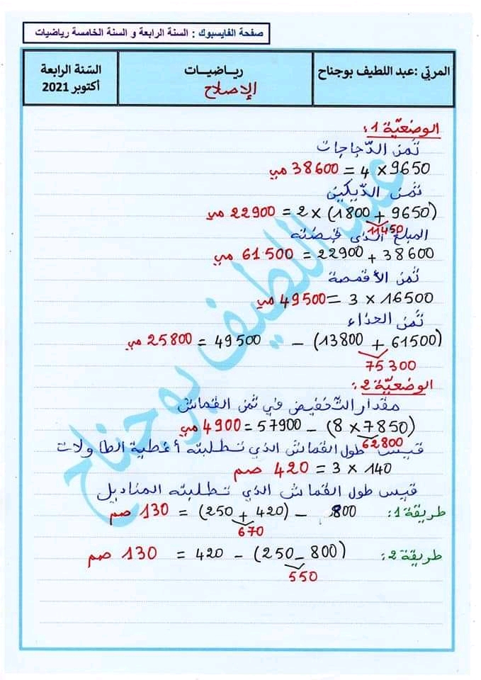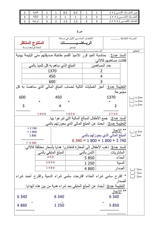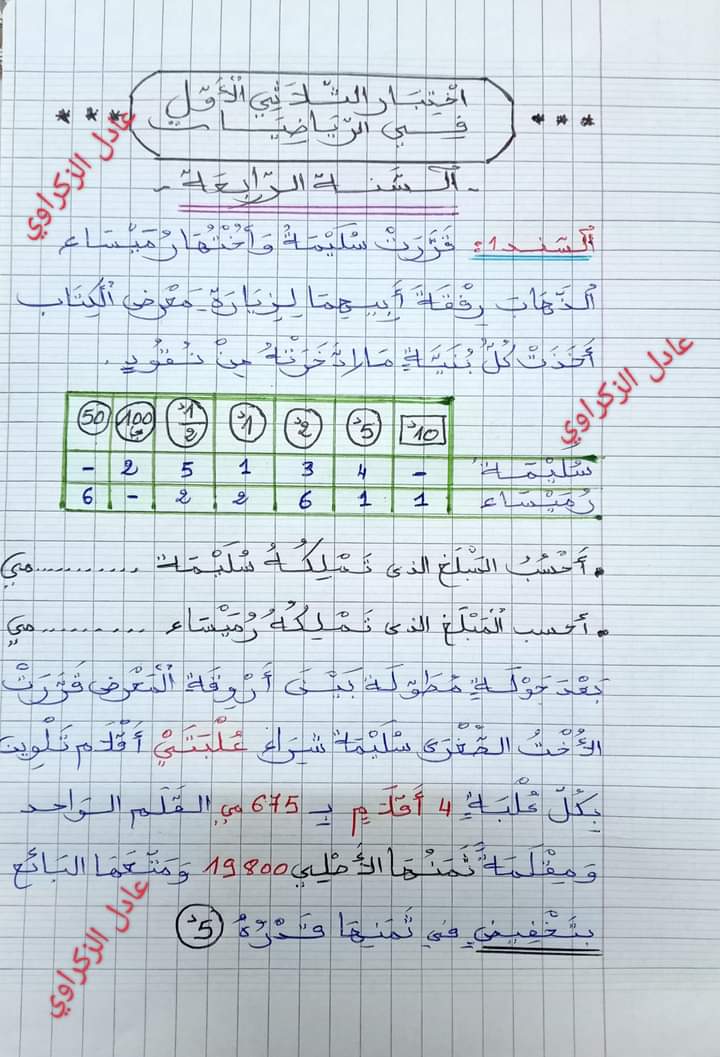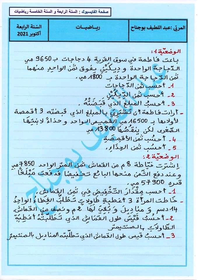 اختبارات رياضيات الثلاثي الأول سنة رابعة ♥️