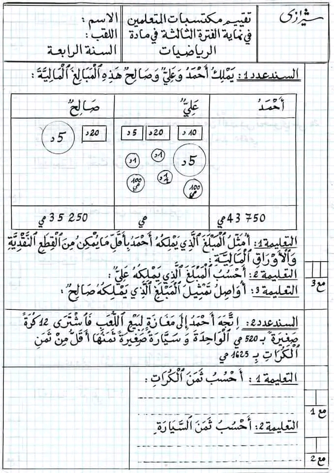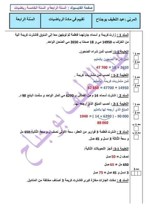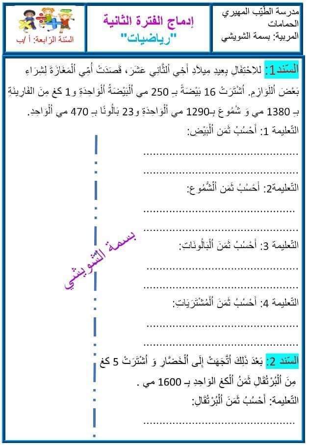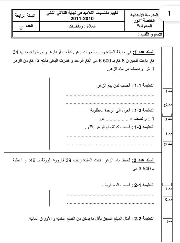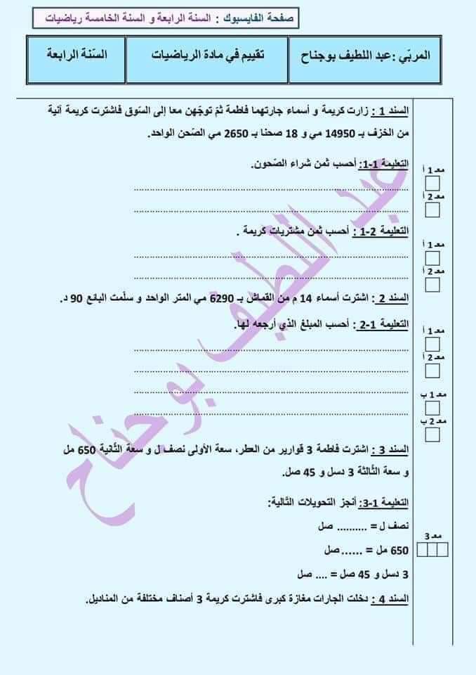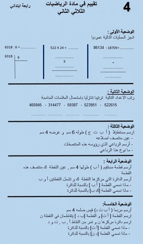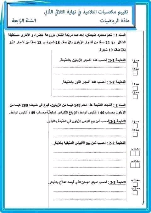 تقاييم رياضيات الثلاثي الثاني سنة رابعة