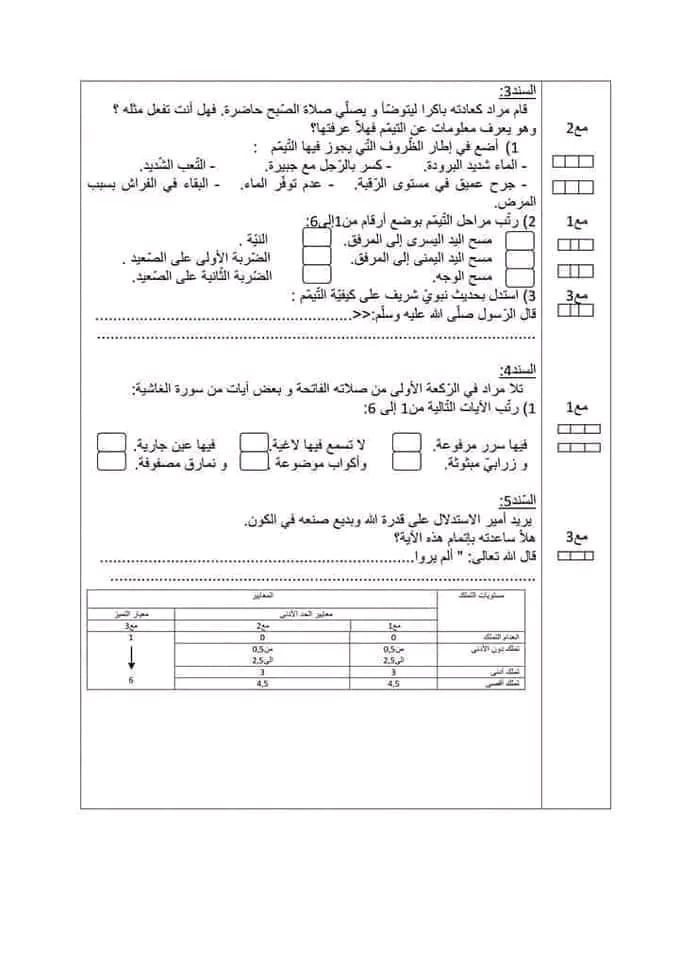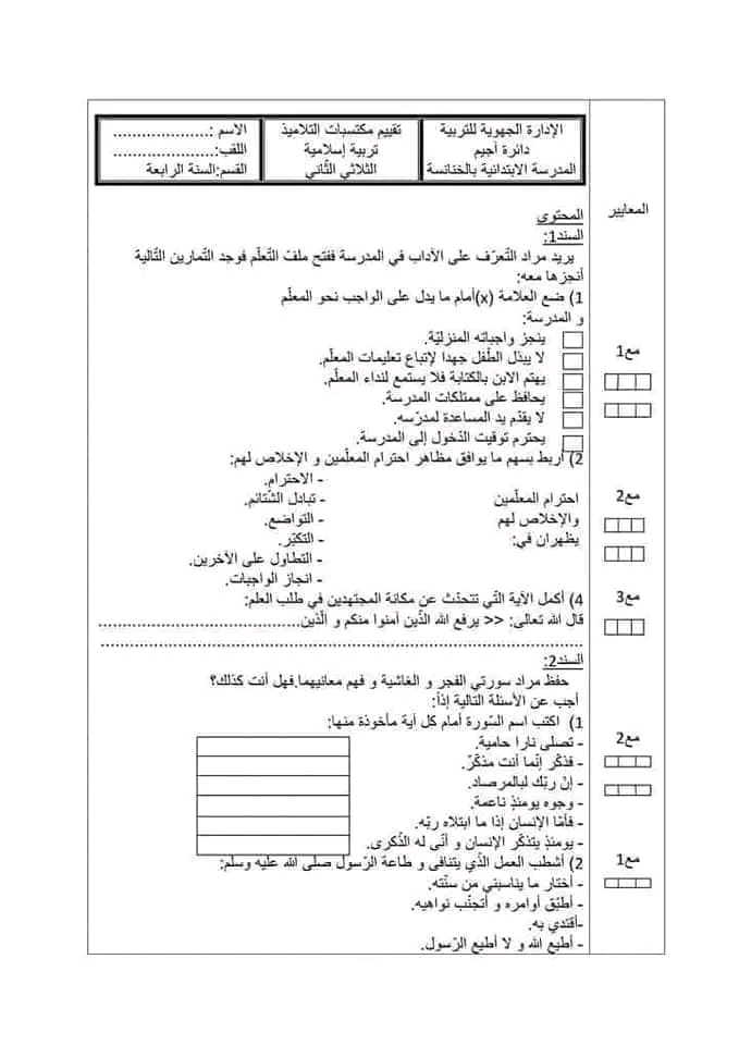 تقييم مكتسبات التربية الاسلامية ثلاثي ثاني سنة رابعة